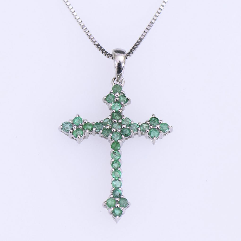 Cross pendant with 30 small emeralds, on delicate Venetian chain with lobster clasp.