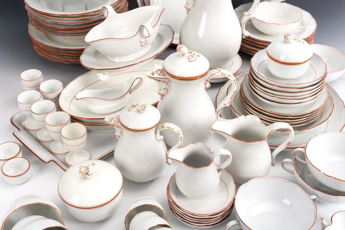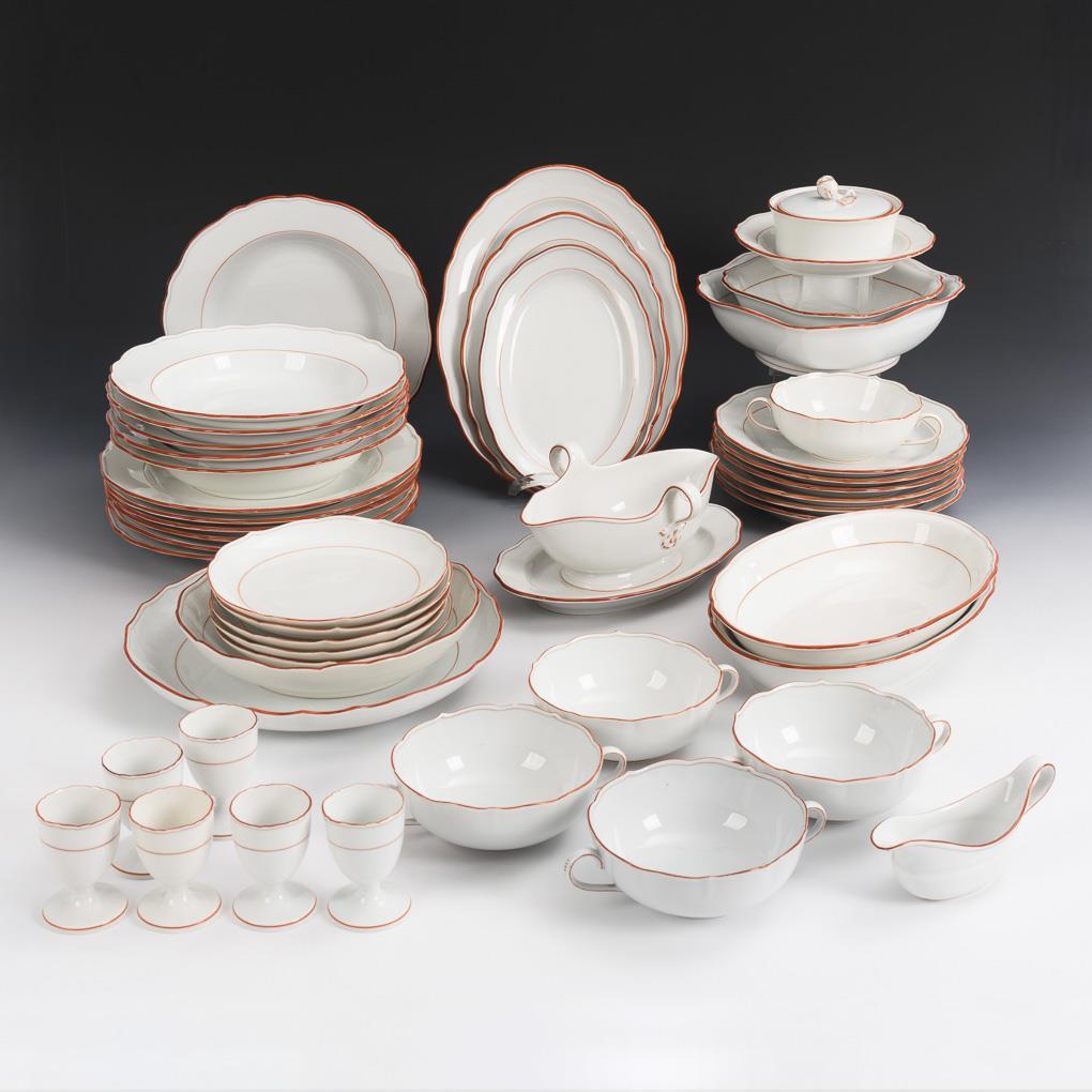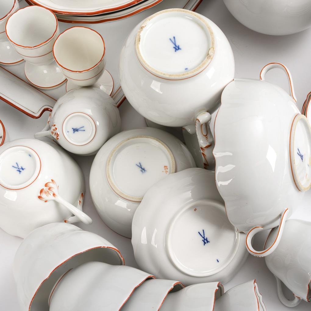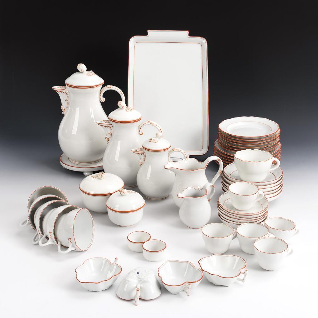 Comprehensive coral rim dinner and coffee service. Meissen.