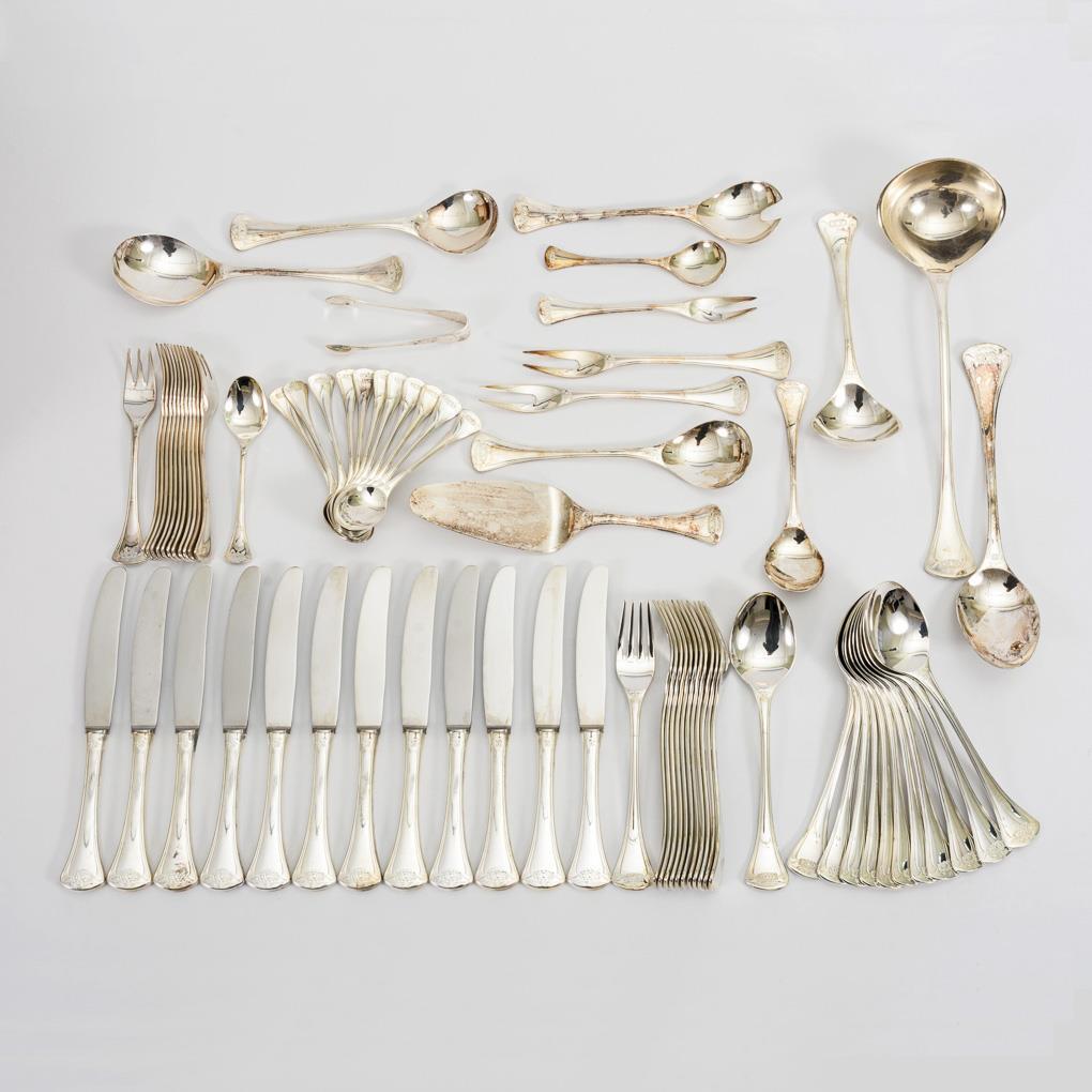 Approx. 74 pieces, floral decorated. 12 knives, 12 forks, 12 cake forks, 12 spoons, 12 small spoons, 3 different serving spoons, salad servers, 2 meat forks, 1 large ladle,1 small ladle, 1 cake server, 1 sugar tongs, 2 small spoons, 1 fork. Little used.