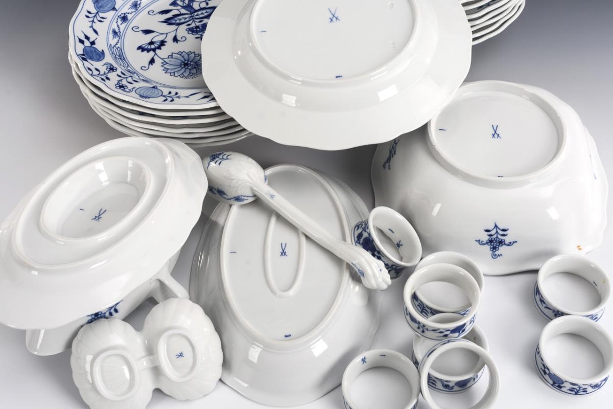 30 parts. Form "New Cutout". 8 dinner plates, 8 soup plates, 1 square bowl (22 x 22,5 cm), 1 sauce boat, 1 oval bowl (L 25 cm), 1 oval plate (L 30,5 cm), 8 napkin rings (Ø 6 cm), 1 spice bowl and 1 serving spoon.