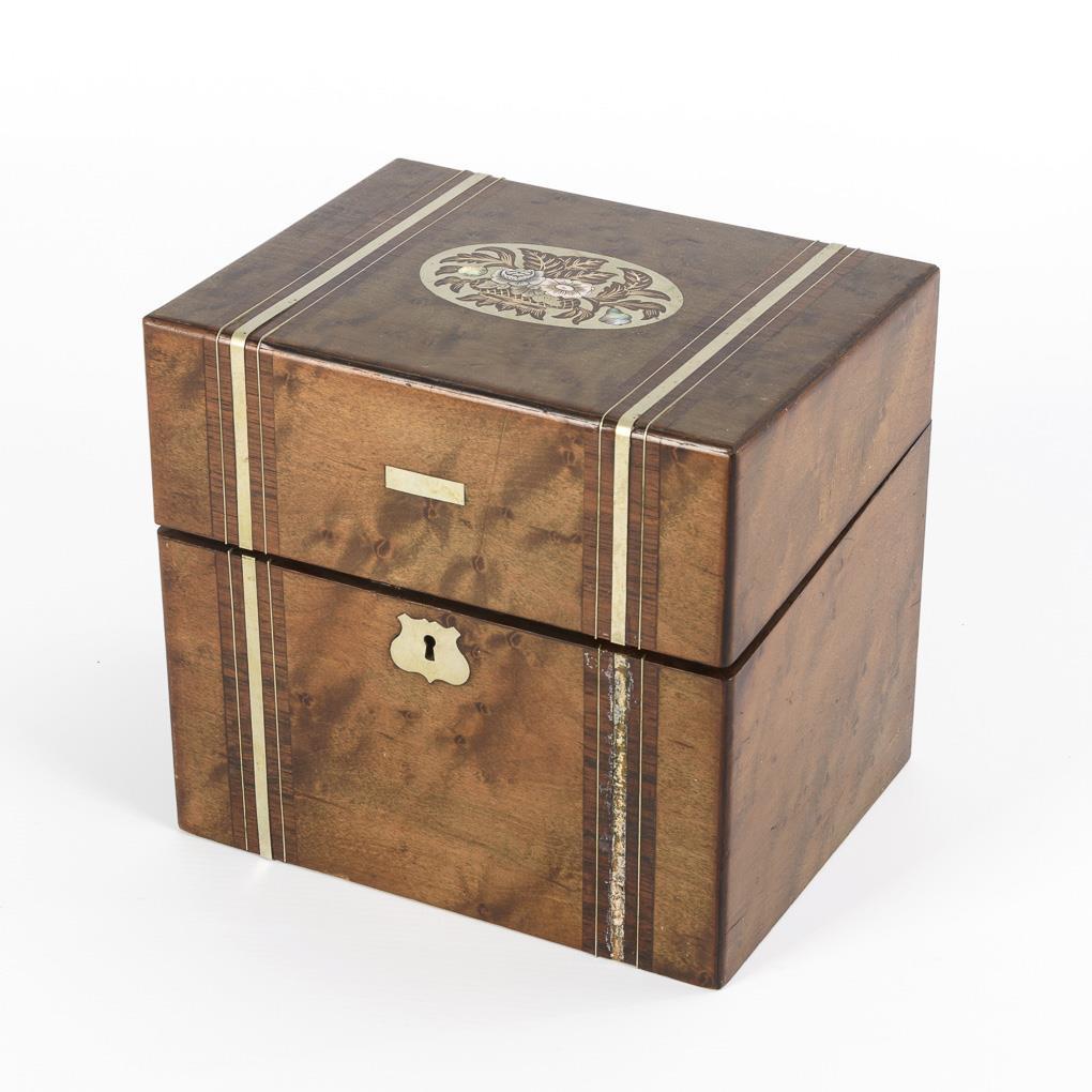 Casewood veneered, inlaid with rosewood, metal and mother-of-pearl. Cut clear glass. 18 x 20 x 15 cm.