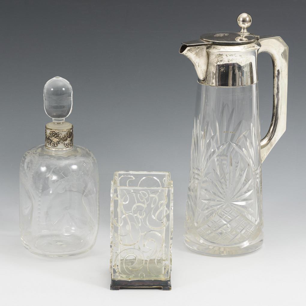 Cut lead crystal teapot with flat silver lid and monogram engraving "CE" (h 27,5 cm). / Finely cut flacon with rocaille decoration and openwork silver mount on the neck. (H 20,5 cm). / Square vase with flat silver base (h 11.5 cm).