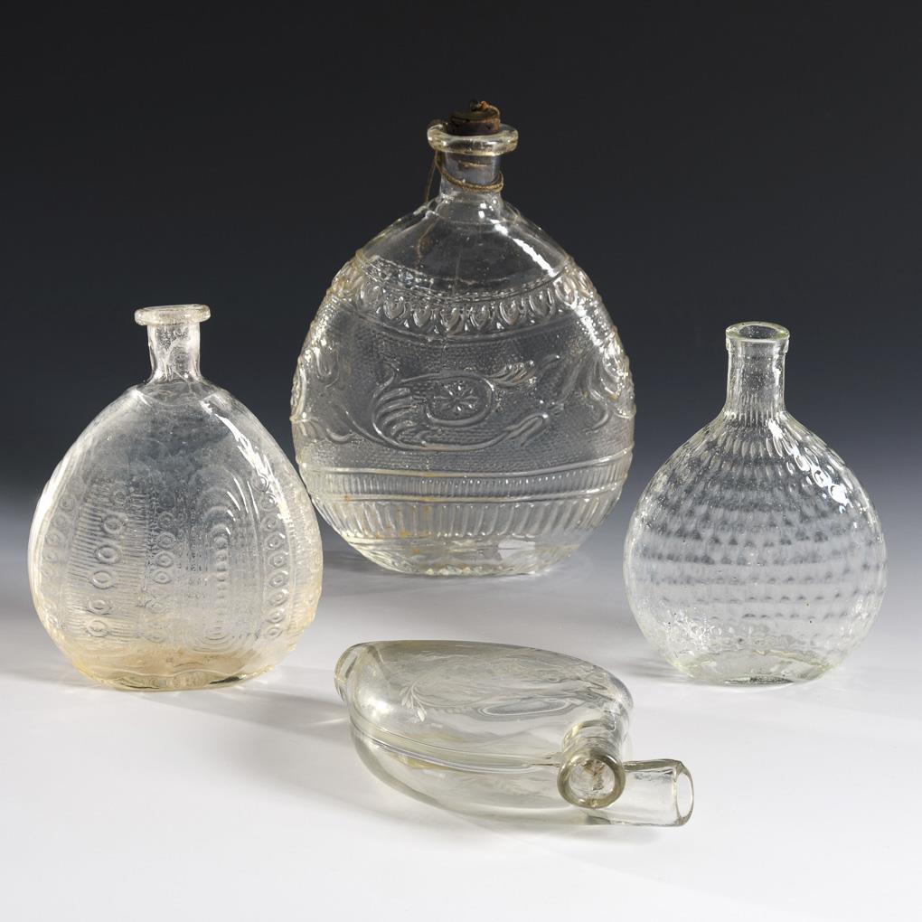 2 bottles with ornamental pattern, 1 double bottle with engraved inscription "T. Barich" and 1 bottle with honeycomb pattern.