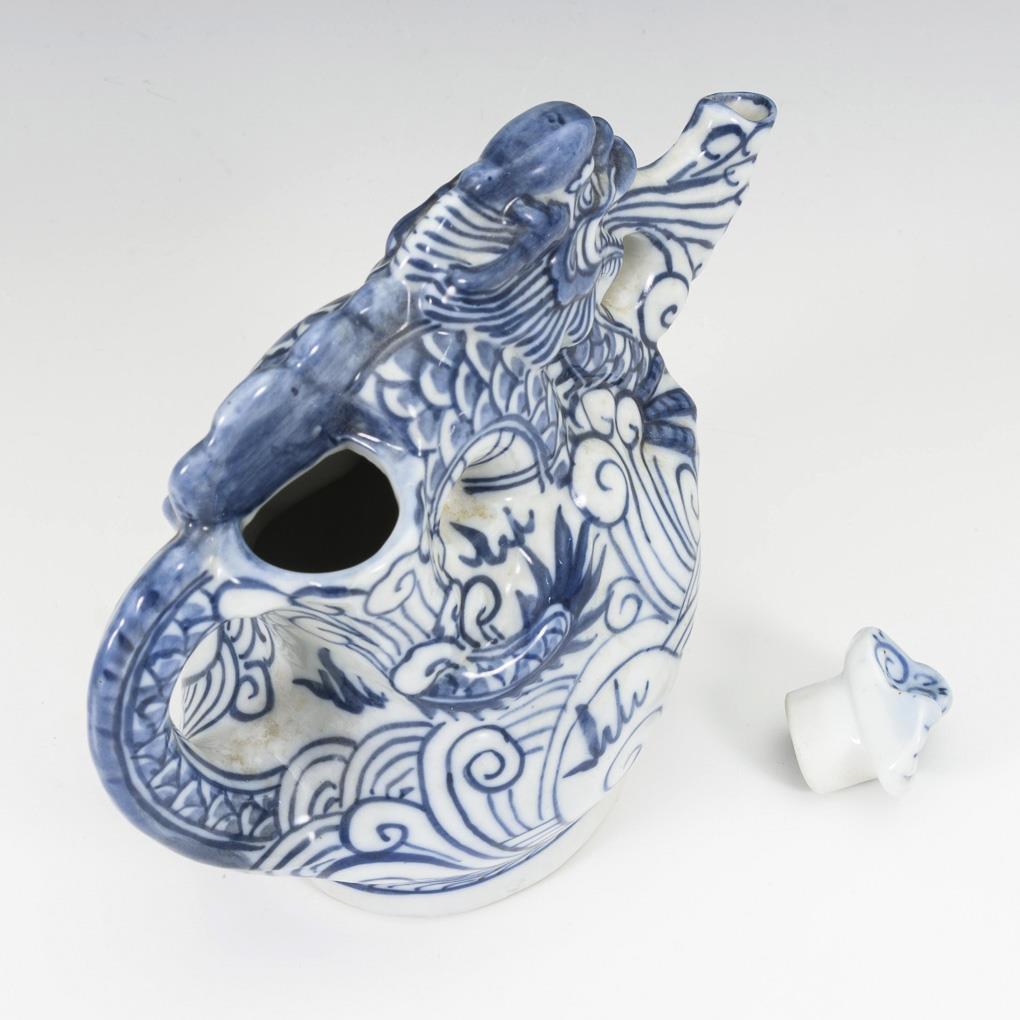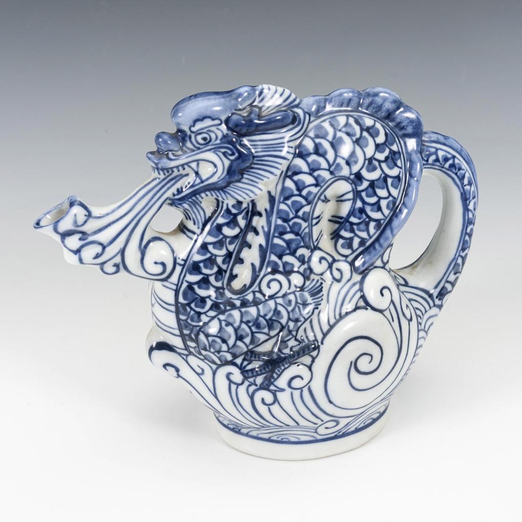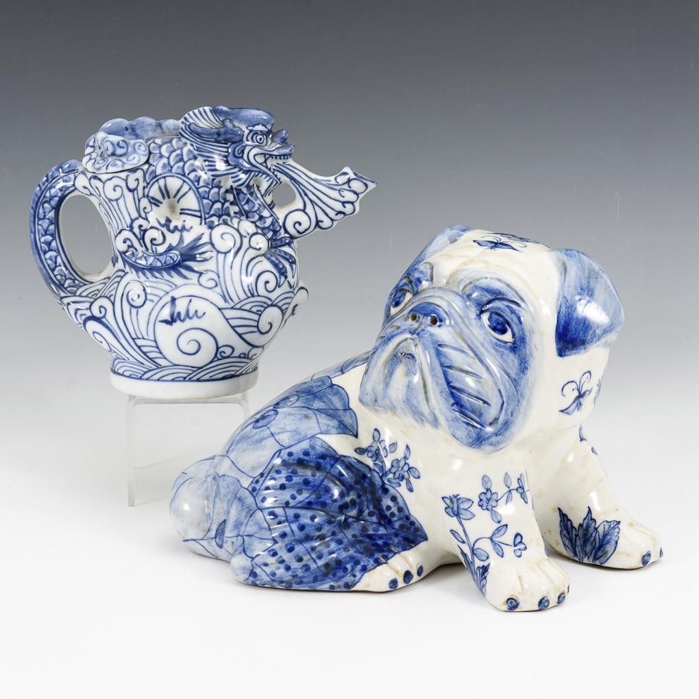 Sitting pug as well as jug in the shape of a dragon.