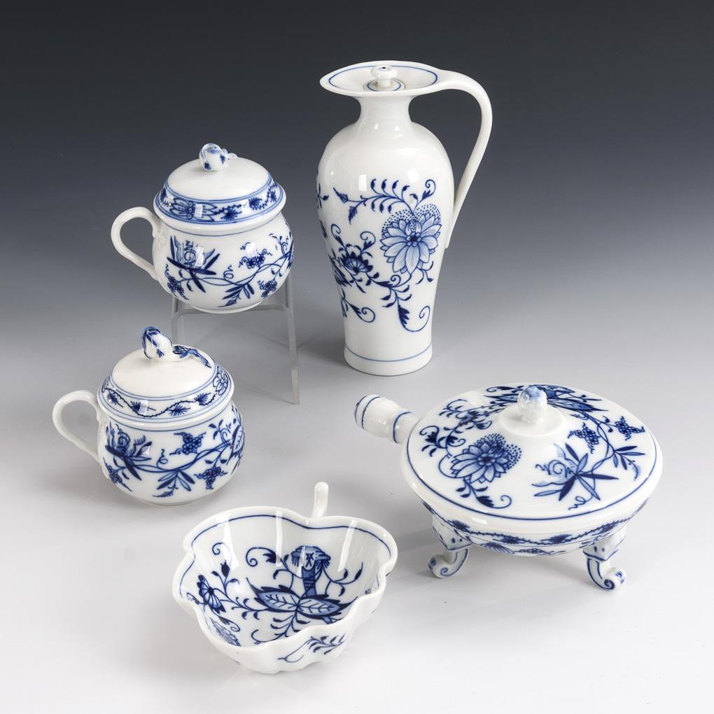 Vinegar jug (h 17,5 cm), 2 créme pots (h 9 cm), 1 leaf bowl (l 12,5 cm) and 1 stemmed pot (h 9 cm). Minimal bumping to 1 rose finial.