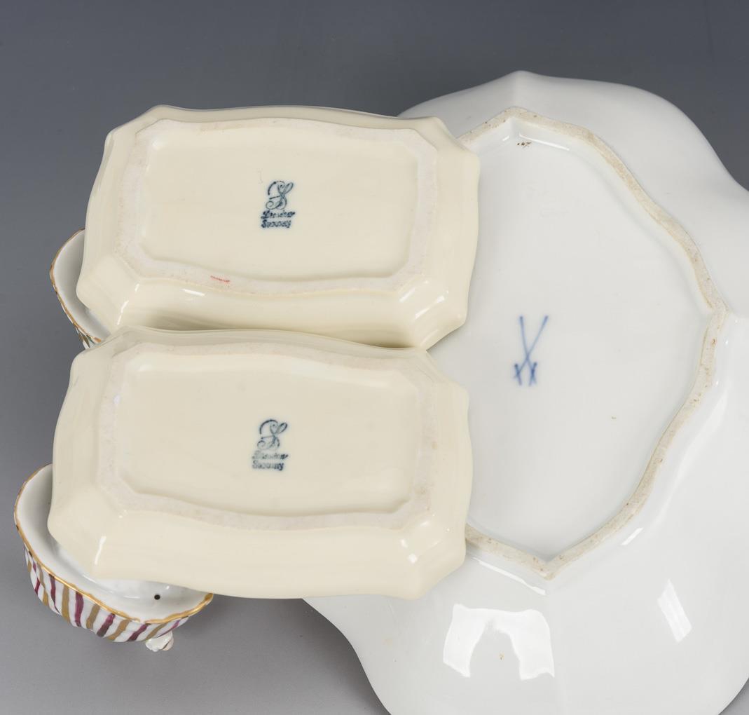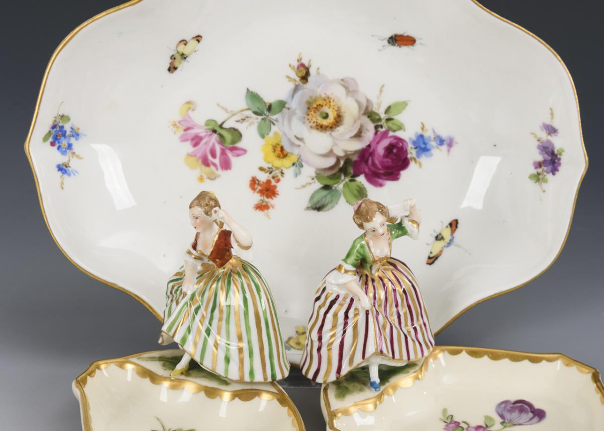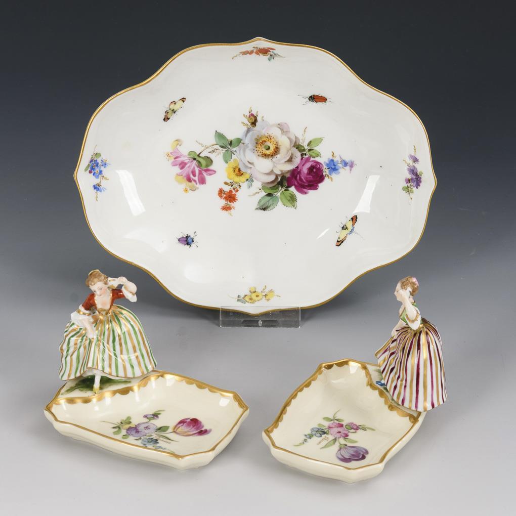 1x marked Meissen, 1934 - 1945, 1st choice: quatrefoil bowl with floral and insect painting (l 18.5 cm). / 2x marked Potschappel, from 1901: rectangular small bowl with the figure of a dancing rococo lady on the rim (L 9.5 cm, H 7.5 cm).