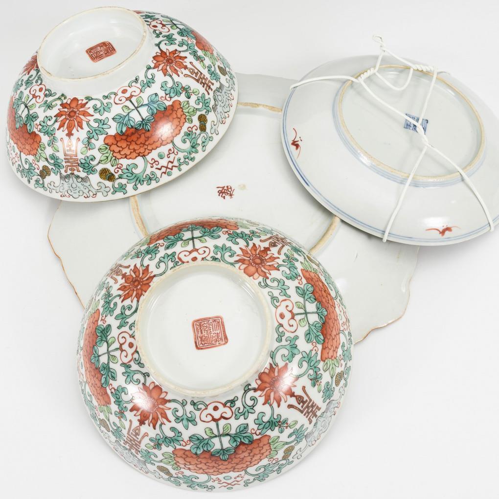 Plate with curved rim, with pair of pheasants on plum blossom branch and flowers against black background. / 2 mugs and small plate with colored floral decoration and characters.