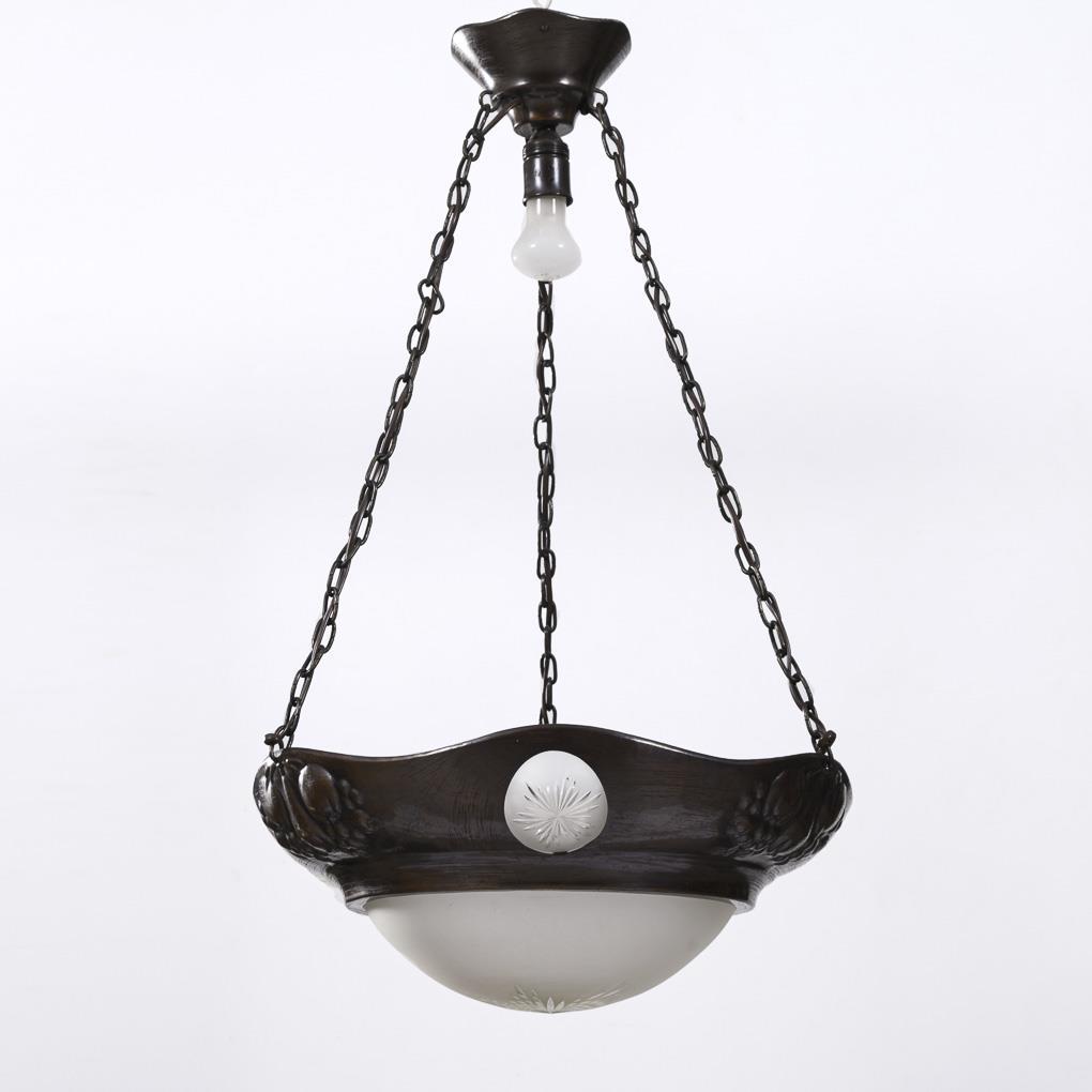 3-light hanging lamp with projecting brass ring and inset glass bowl, on 3-way chain suspension with 1-flame conical canopy; brass body decorated with fruits in relief and 3 small glass inserts; glass bowls with notch decoration. Slight signs of age/use.