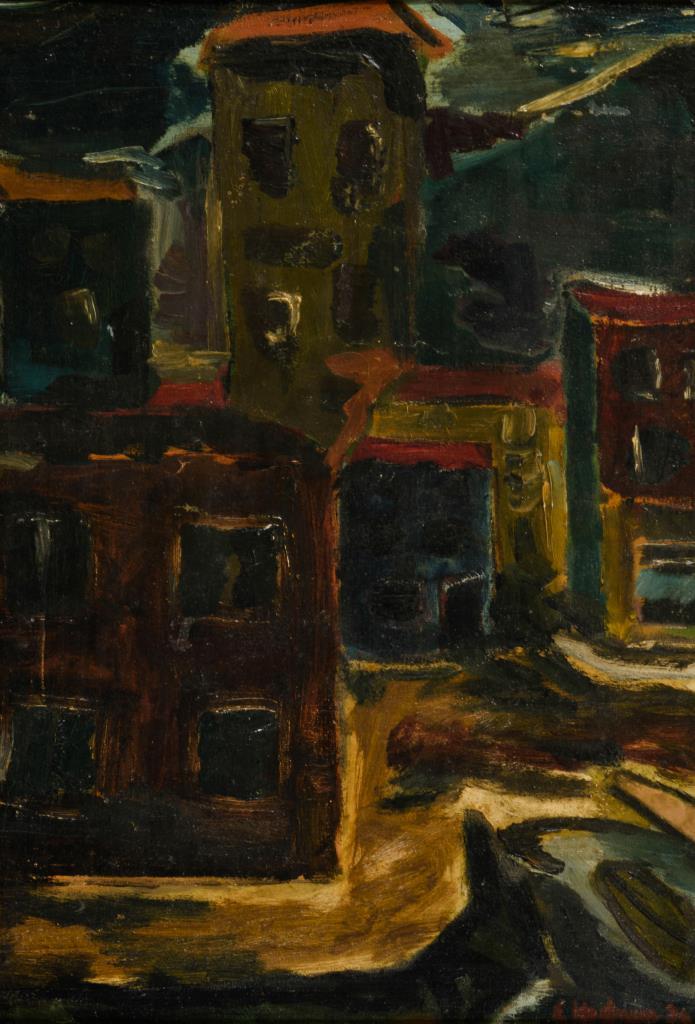 Expressiv gemalte Hochhäuser unter dunklem Himmel.