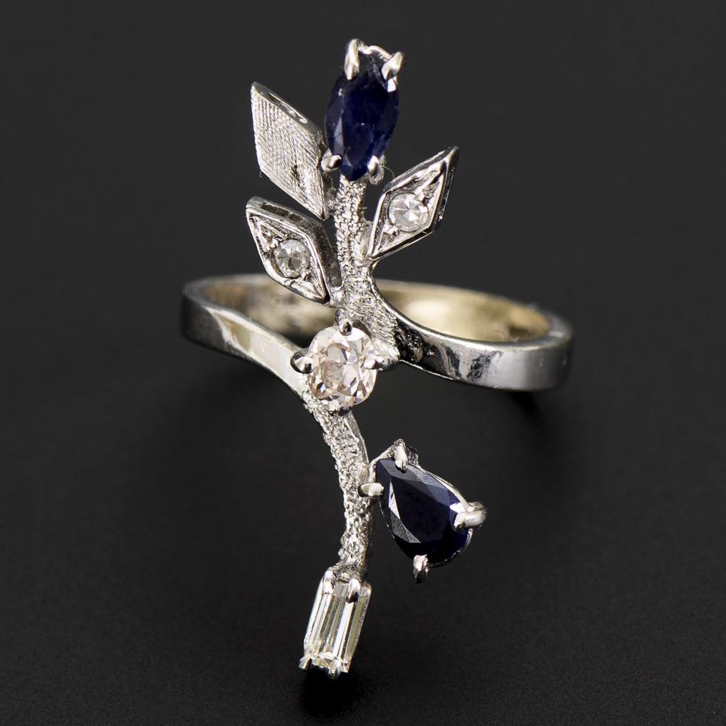 Between opposing rail center 2 chaton set sapphires, 1 diamond baguette, 1 diamond and 2 small inset diamonds.