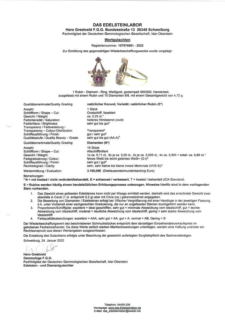 Yellow gold 585 stamped. Handmade. Ring size 61. ruby approx. 0.25 ct/ diamonds together approx. 0.60/G-I/vvs-si. 4,7 g.