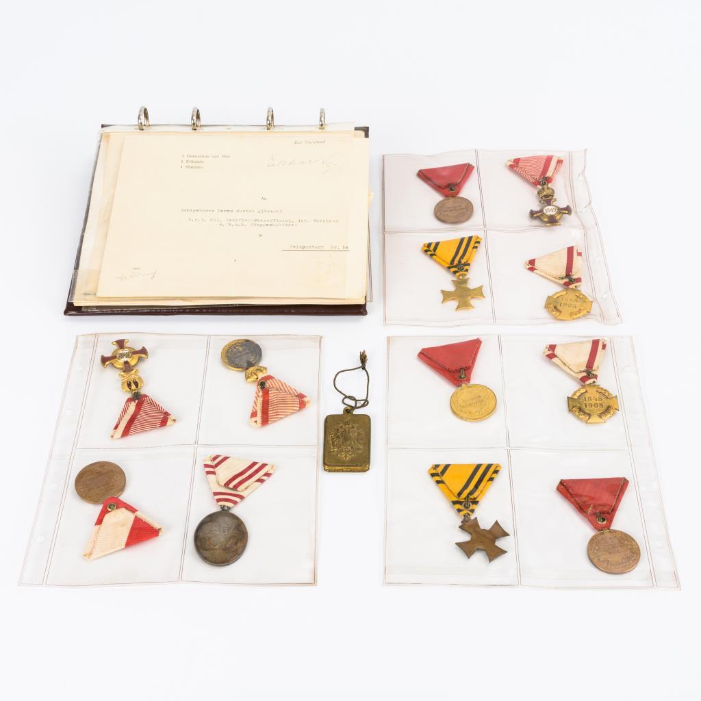 1 gefüllter Identifikations-Anhänger mit dem Monogramm von Franz Joseph I. sowie verschiedene Orden/Auszeichnungen am Band. Einige Alters-/ Gebrauchsspuren.