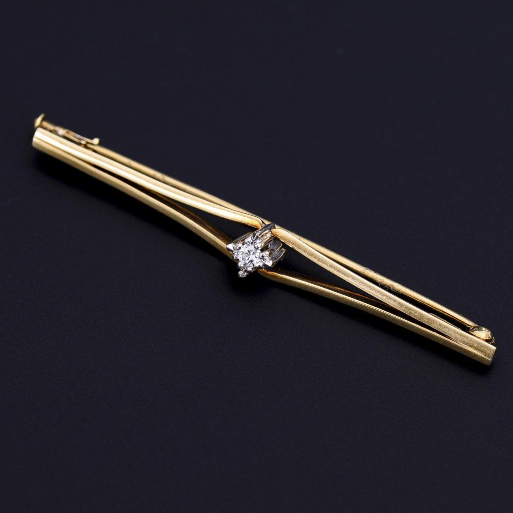 Small chaton-set brilliant-cut diamond, between 2-bar pin. Sliding hook.