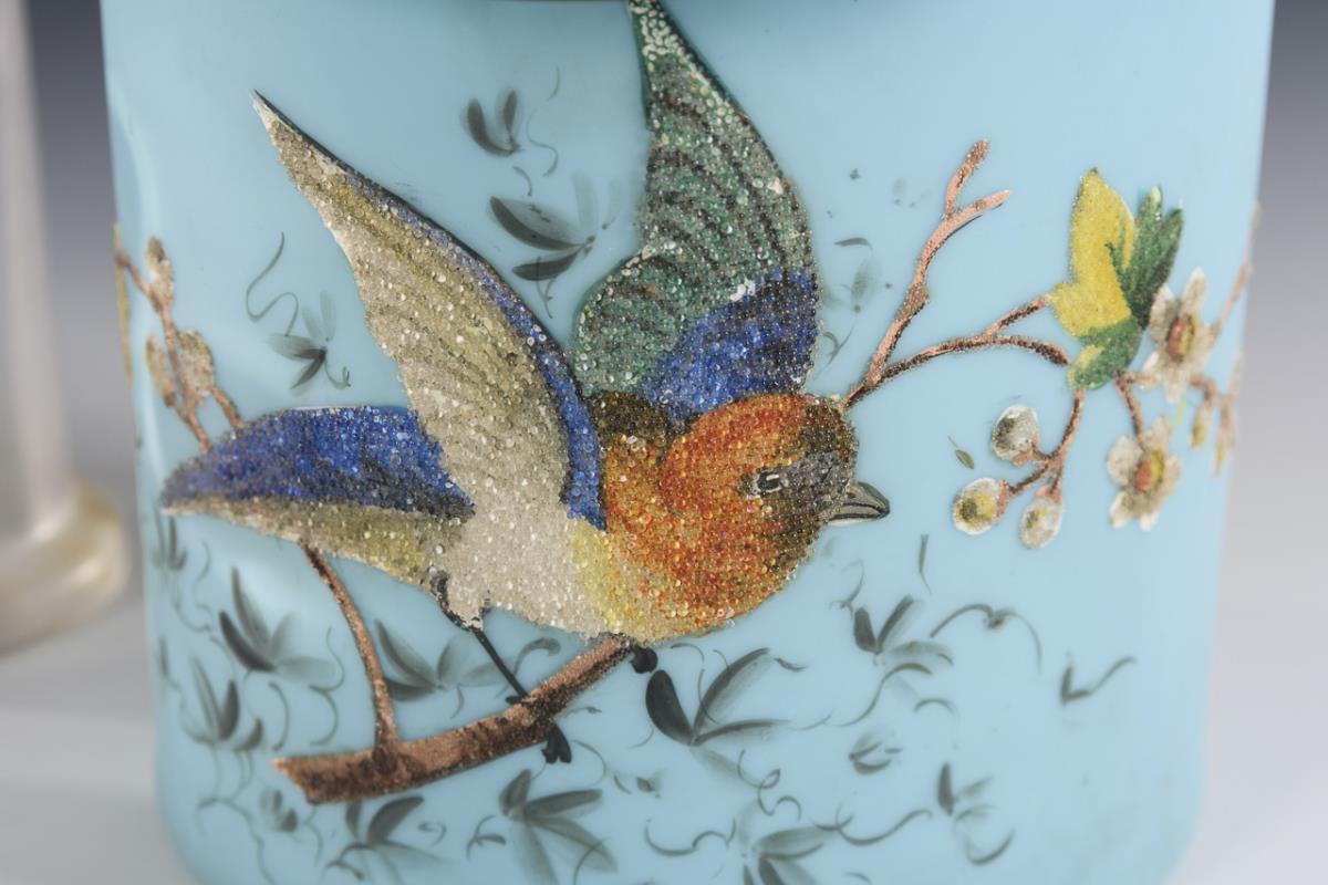 1x cylindrical box made of light blue milk glass with brass mounting and on the front polychrome enamel painted and glass beaded bird motif (h 23.5 cm). / 1x slightly convex vase with metal mounting and fused red glass drops (h 24 cm). / 1x oblique optic blown rod vase with polychrome enamel painted flowers and berries (h 19 cm). Minimal gold abrasion on the vase.