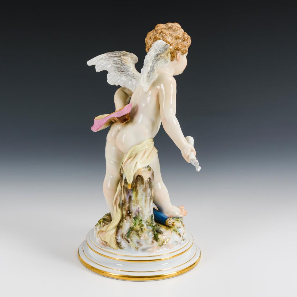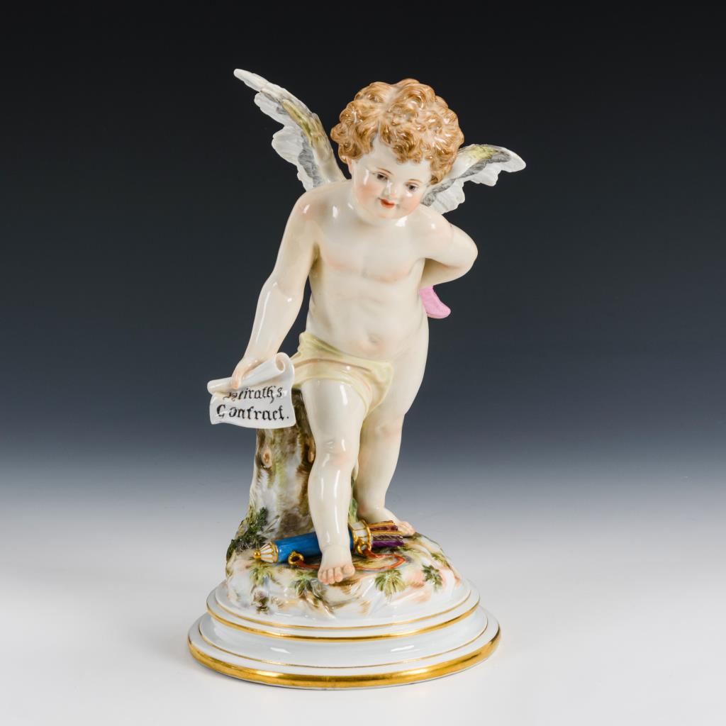 Große Figur eines auf einem Rundsockel stehenden Amorknaben, einen Pantoffel und eine Schriftrolle haltend. Schriftrolle restauriert.
