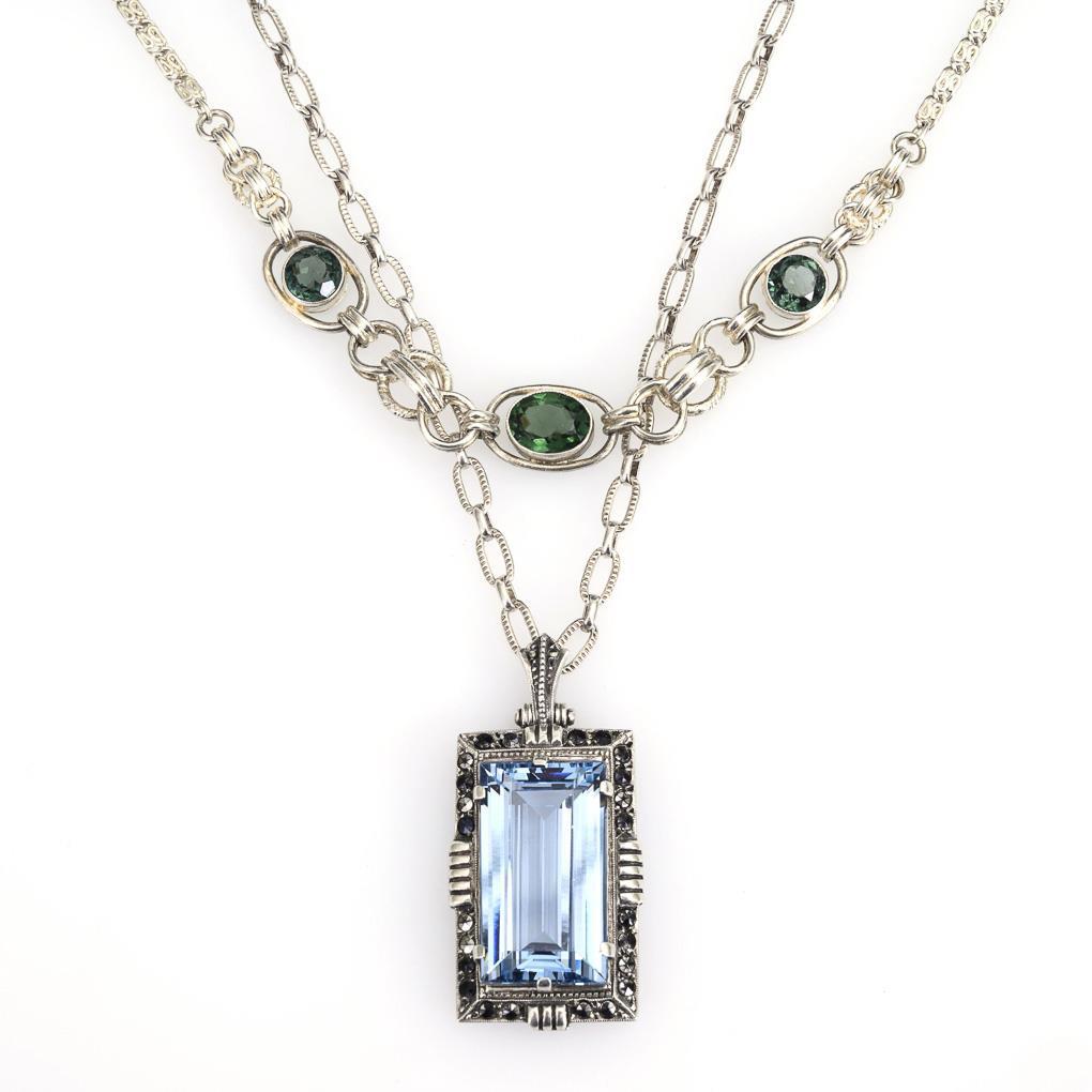 Pendant with claw-set large aquamarine and marcasites on rough anchor chain. 3 rim-set imitation tourmalines between ring links and S-shaped curb chain. Ring spring clasps.