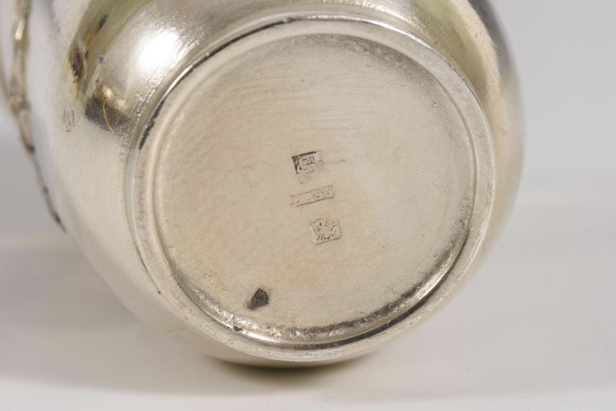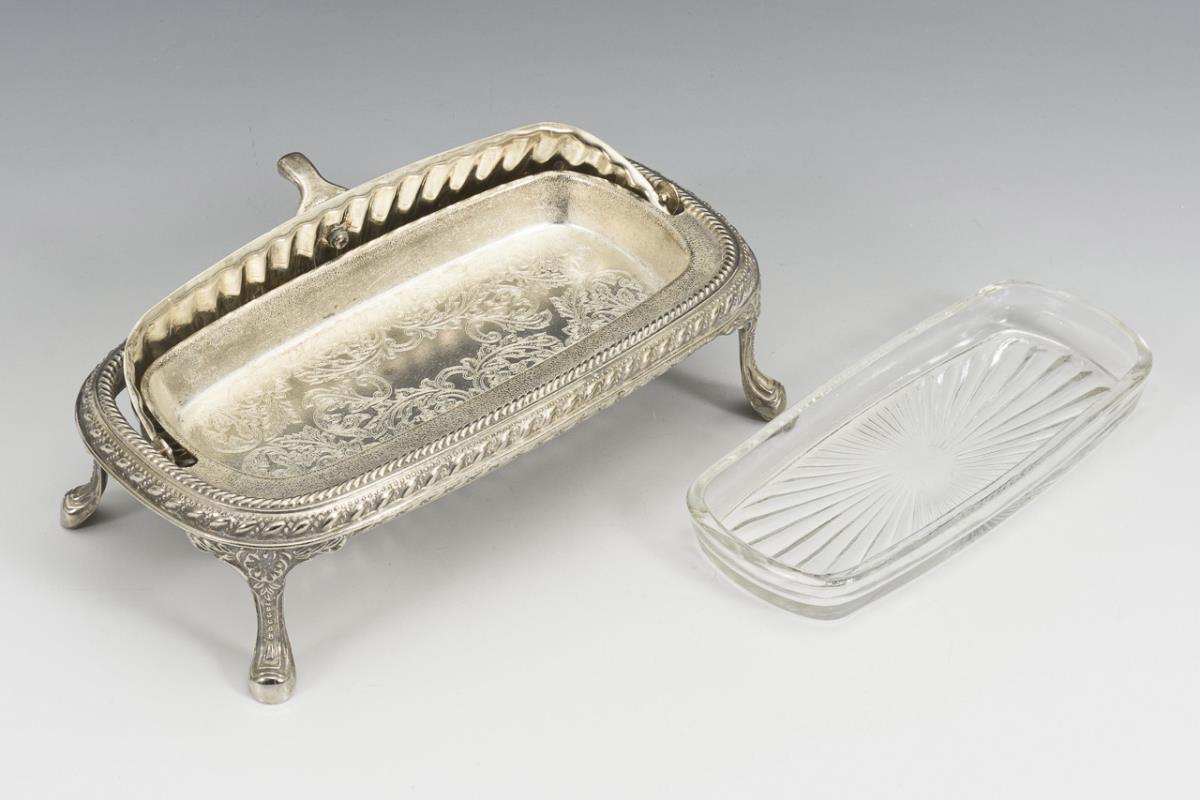 Elegant caviar bowl with pivoting hood and glass insert, openwork bottle holder, fish as napkin holder and 5 brandy cups with garland decoration. Signs of use.