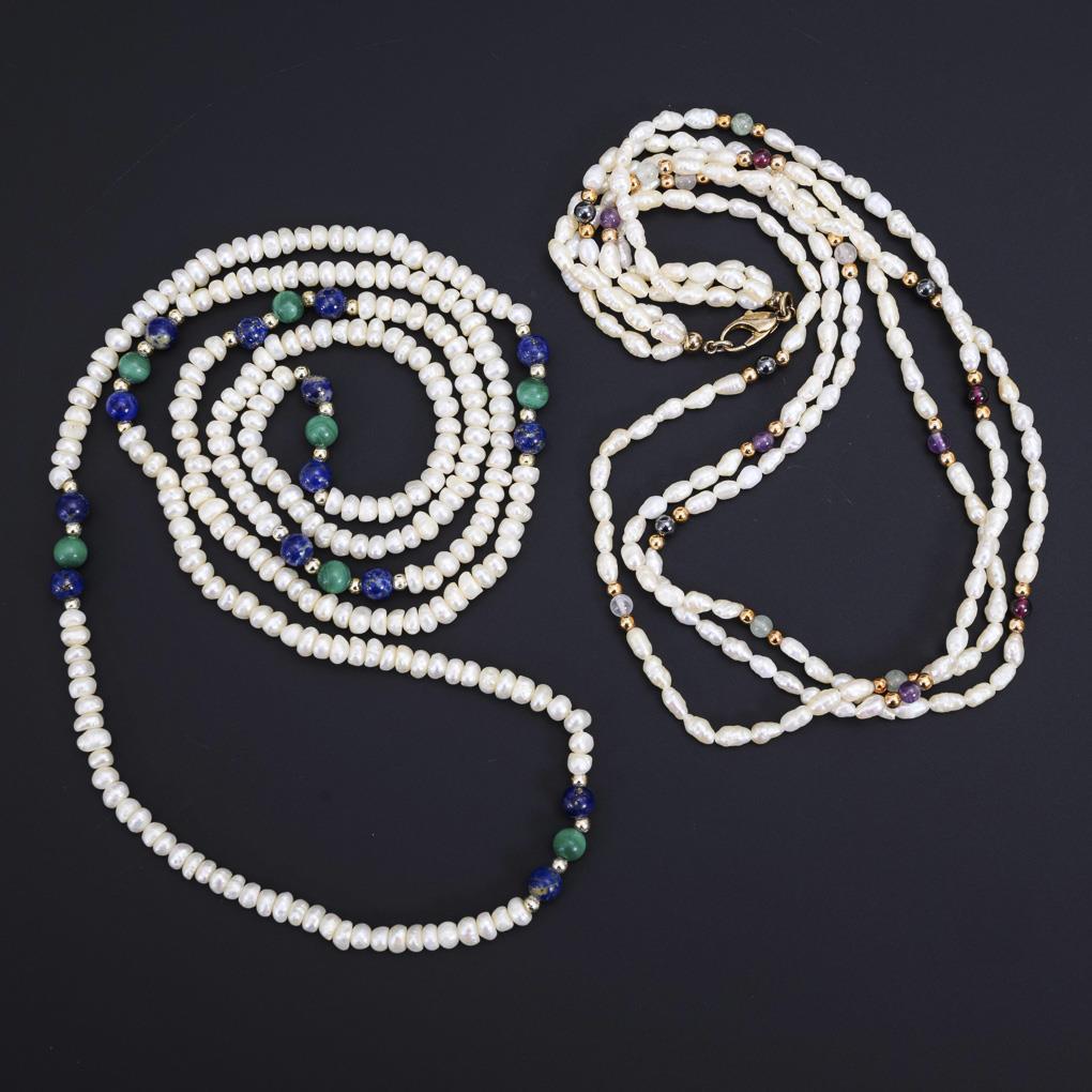 Continuous cultured pearl necklace with malachite and lapis lazuli beads. 2-row lace necklace with garnet, amethyst and hematite beads, on lobster clasp.
