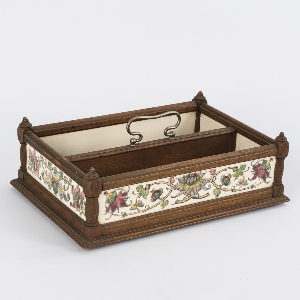 Massive oak, dark stained, earthenware with colorfully staffed printed decoration. 12.5 x 37 x 25 cm.