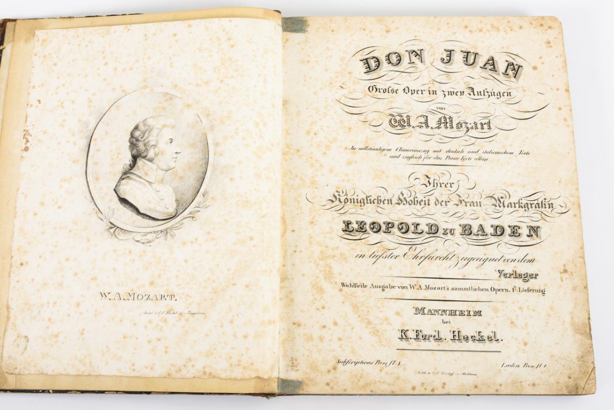 "Lenore" and "Des Pfarrers Tochter von Taubenhayn" by G.A. Bürger in Musik gesezt (sic) by I.B. Zumsteeg. Title with copper engravings. 34 and 21 pages with engraved notes. 24 x 33 cm. / "La Flûte enchantée de Mozart" and "Le Chalet, d'Ad. Adam." 54 and 60 pages of music, Schonenberger, Paris. 34 x 27 cm. / "Mozart: "Don Juan" grand opera in two acts, 217 pages, some foxing / Mozart: "Magic Flute", grand opera in two acts. For the last two works: in complete piano score with German and Italian texts and at the same time for pianoforte alone. Mannheim by K.F. Heckel. Sheet music in copperplate