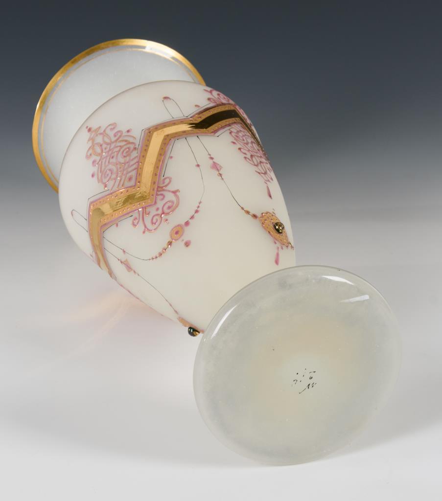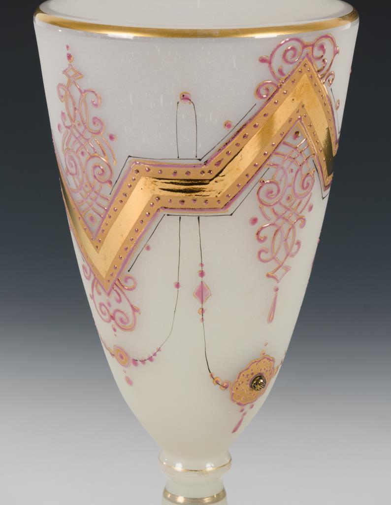 Weißes, mattiertes Alabasterglas, Reliefmalerei in Gold und Rosa, aufgesetzte Glascabochons.H 38 cm.