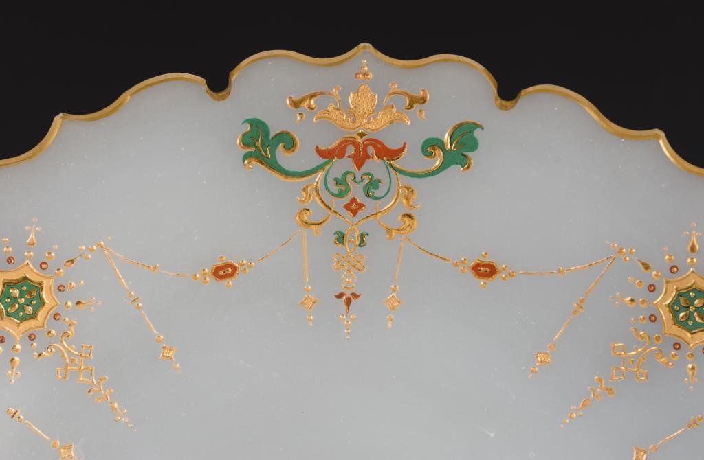Weißes, mattiertes Alabasterglas, Reliefmalerei in Gold, Grün und Korallenrot.Ø 32 cm.