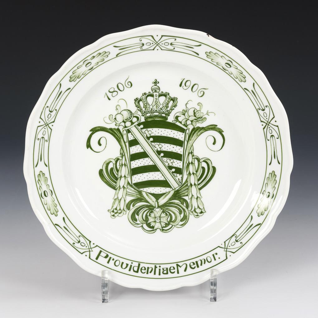 Form "New Cutout". In the mirror the representation of the Saxon coat of arms under the dates "1806 / 1906", on the flag the slogan "Providentiae Memor", plate on the occasion of the centenary of the Kingdom of Saxony.