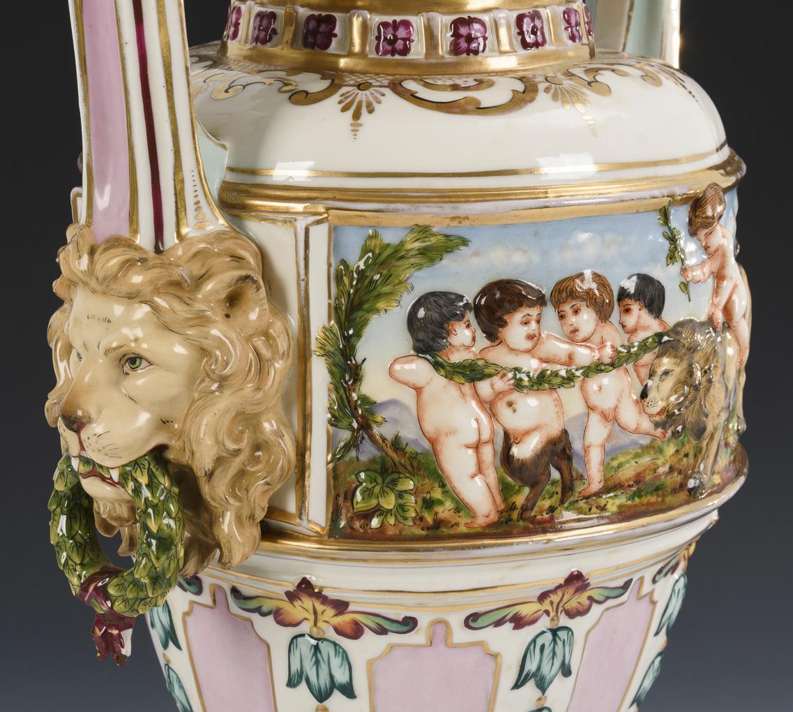 Amphora vase with two lion head handles, crater neck and round base, octagonal plinth. On both sides a rectangular cartouche with a brightly colored painted putti relief. Minimal gold abrasion, minimal bumping on the loops of the laurel wreaths, hairline crack in the base, underneath breakout on the mount.