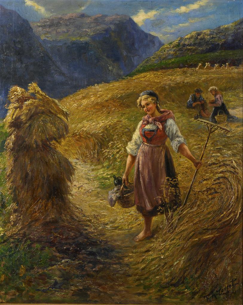 Peasant girl in the cornfield with basket and rake in the sunshine. Minimal signs of age.