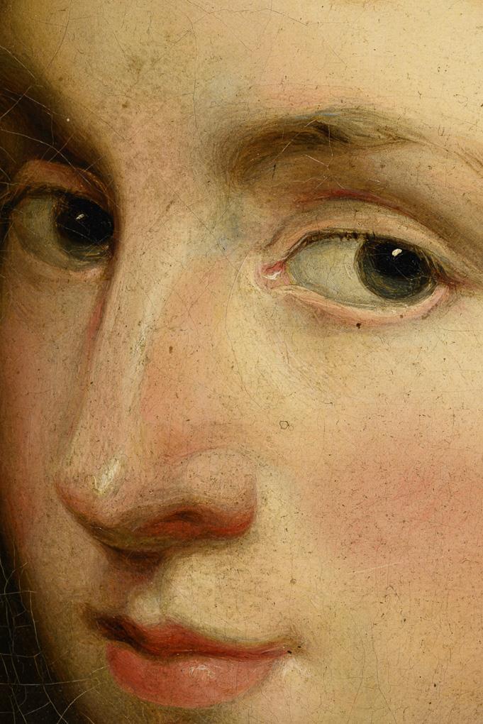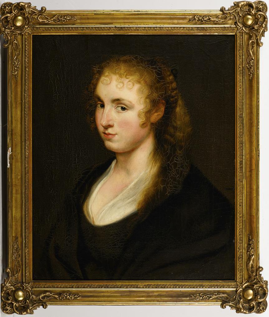 Portrait of a young woman with curly blond hair against a neutral background. Addendum 30.5.22: Copy after Rubens workshop "Portrait of a woman with braided hair" from 1620, today on display in the Gallery Old Masters Dresden. Crazed.