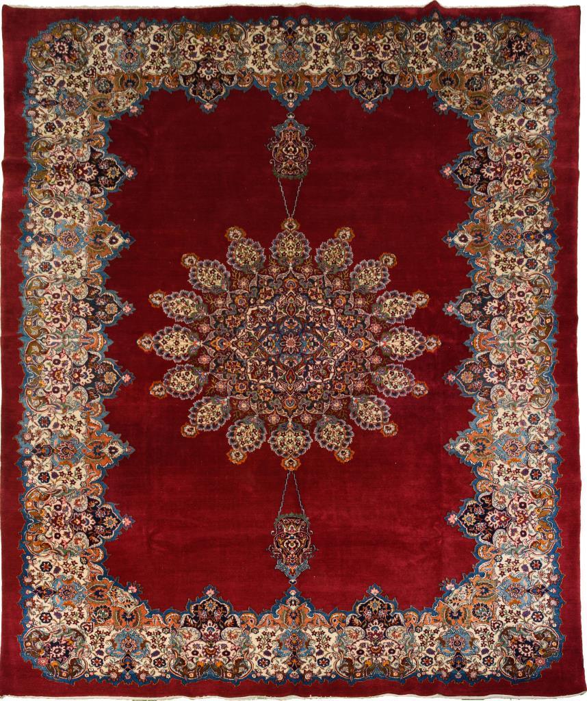Großes 16-teiliges Sternmedaillon mit zwei hängenden Ölampeln auf kirschrotem Fond. Außergewöhnliche florale Bordürengestaltung mit geschweiften Rändern in Anlehnung an die Konzepte von Wolkenkragen und Himmelspforte. In den Zwickelfeldern persisch bezeichnet und datiert. Defekte Fransenabschlüsse.