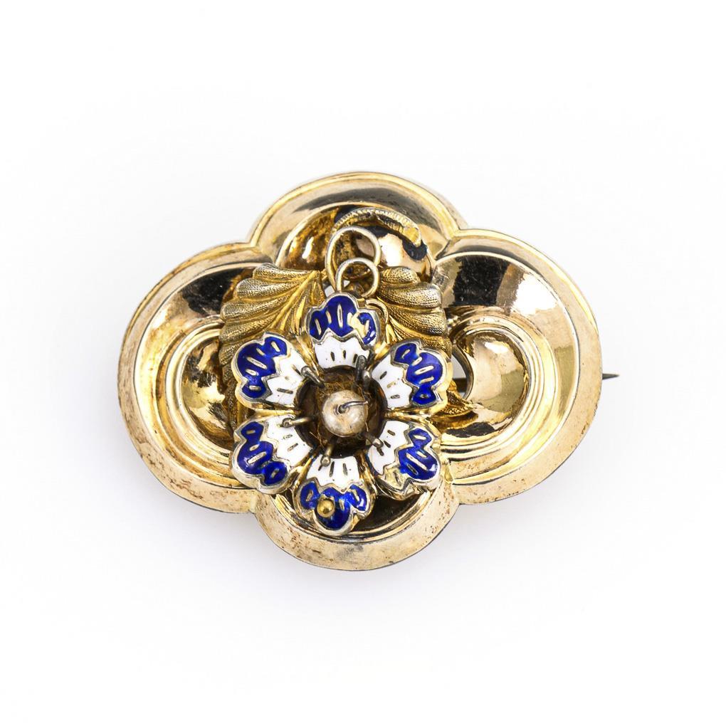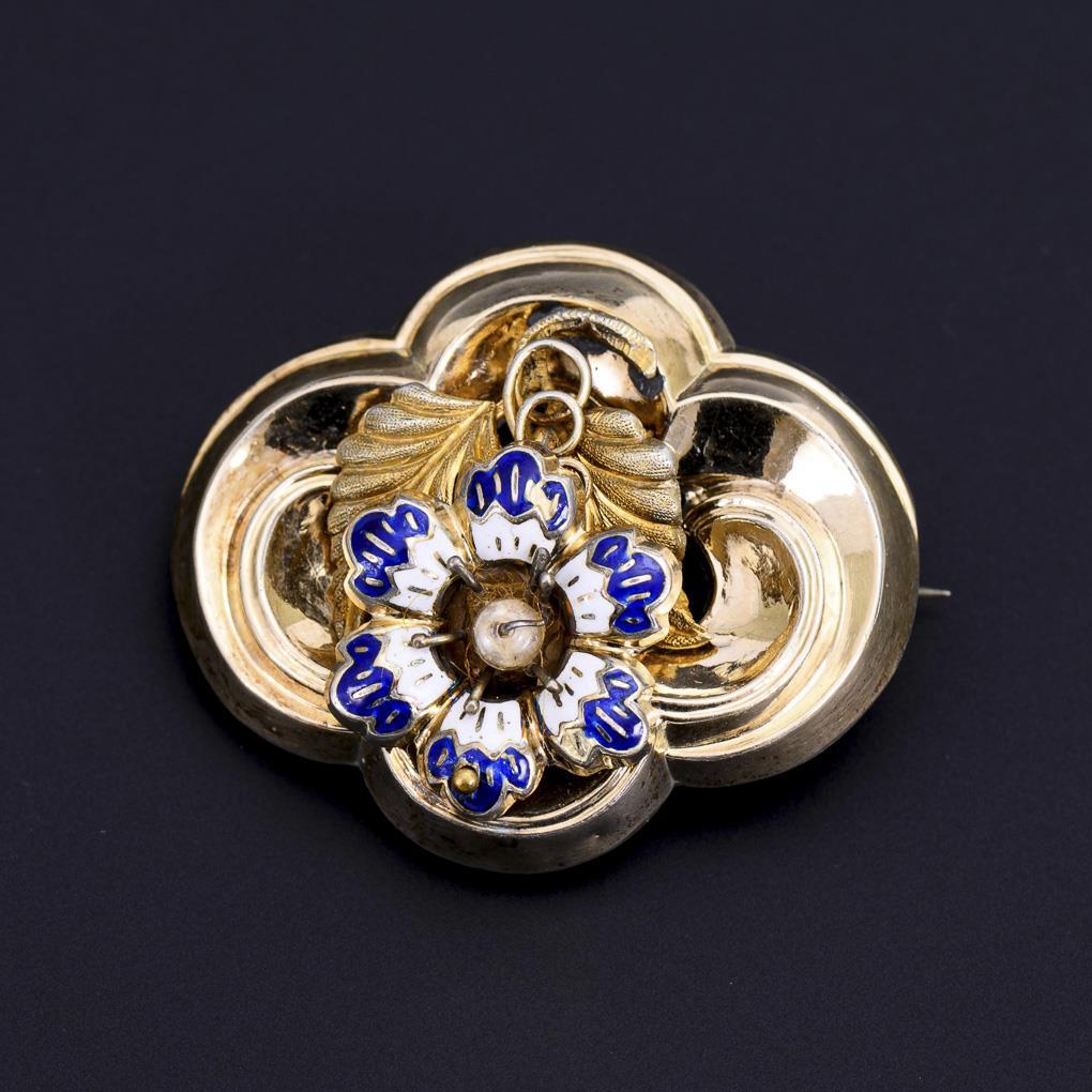 4-passage brooch in relief with enameled mounted flower. Hook clasp, small eye.