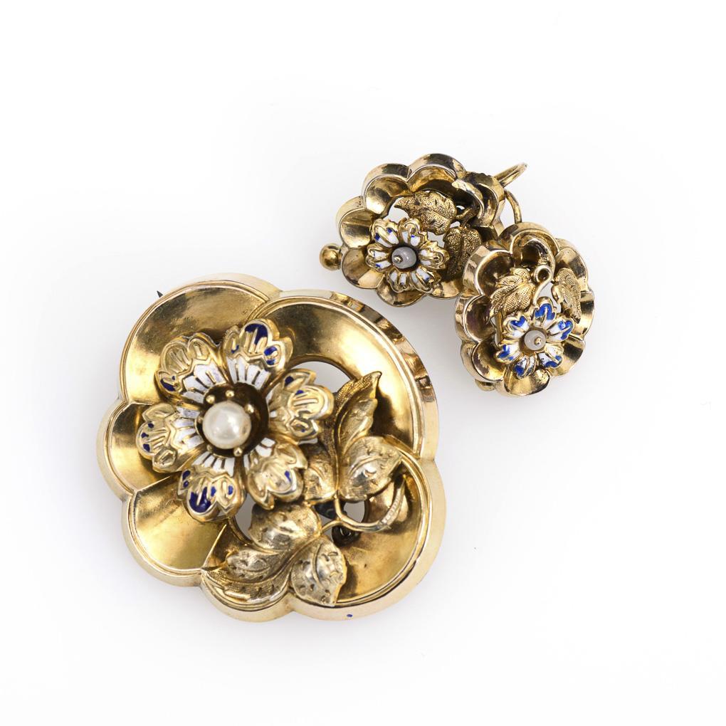 Biedermeier brooch and pair of earrings with enamel.