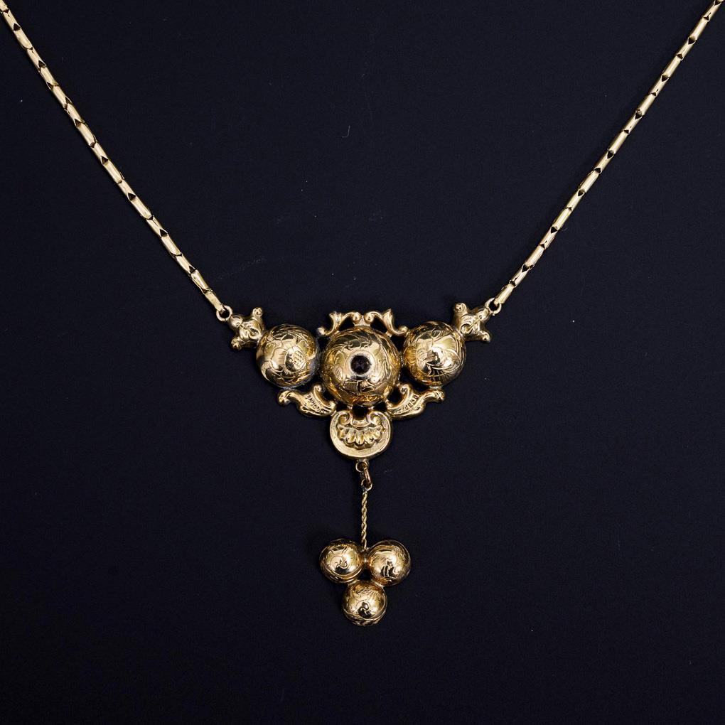 Pounded repair spot, chain suitably supplemented, brooch and pair of earrings of parure not present.