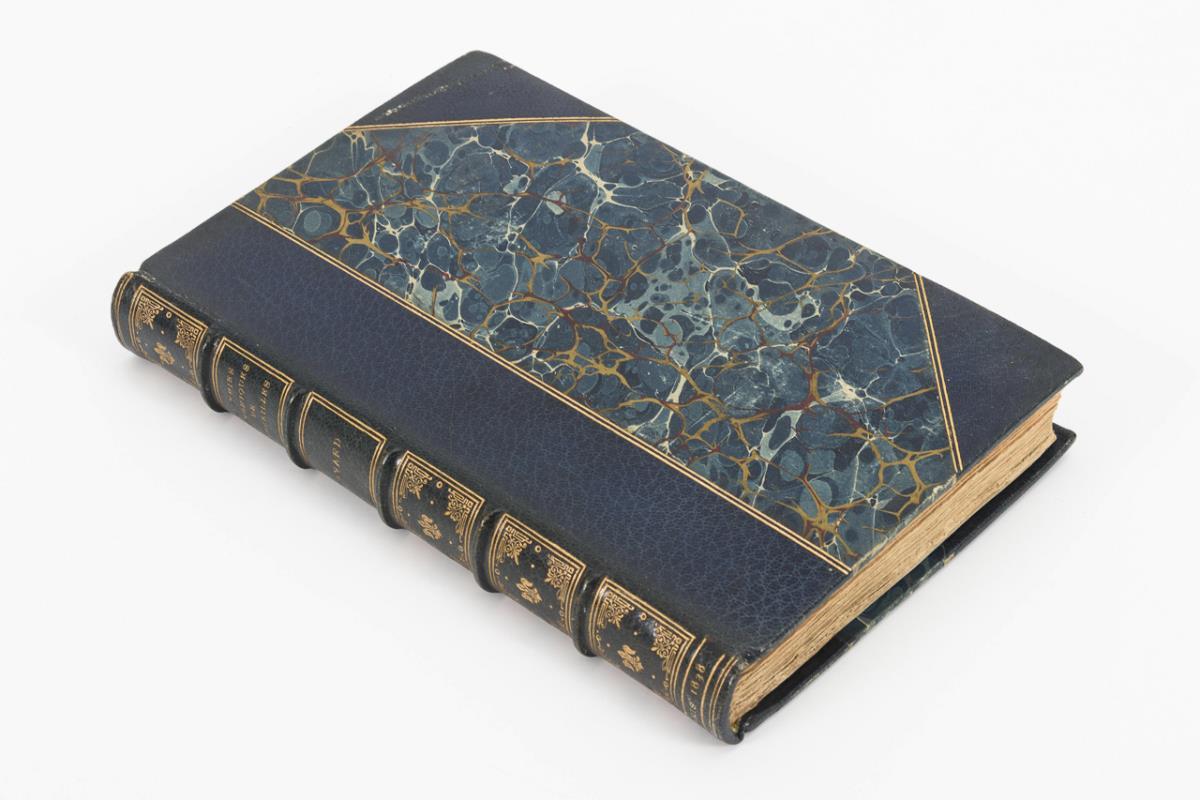 173 Textseiten und 120 Tafeln mit Stichen. Blauer Halbledereinband mit Goldschnitt.