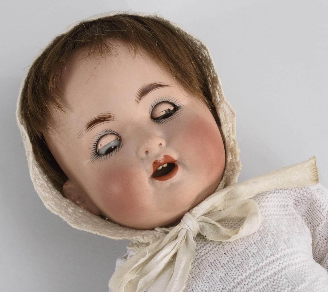 Crank head, brown sleeping eyes, brown human hair wig. 5-piece sitting baby body. White-pink baby clothes. Head x-rayed: without defects. Repaired leg base and bumped toe right, fingers minimally bumped and retouched.