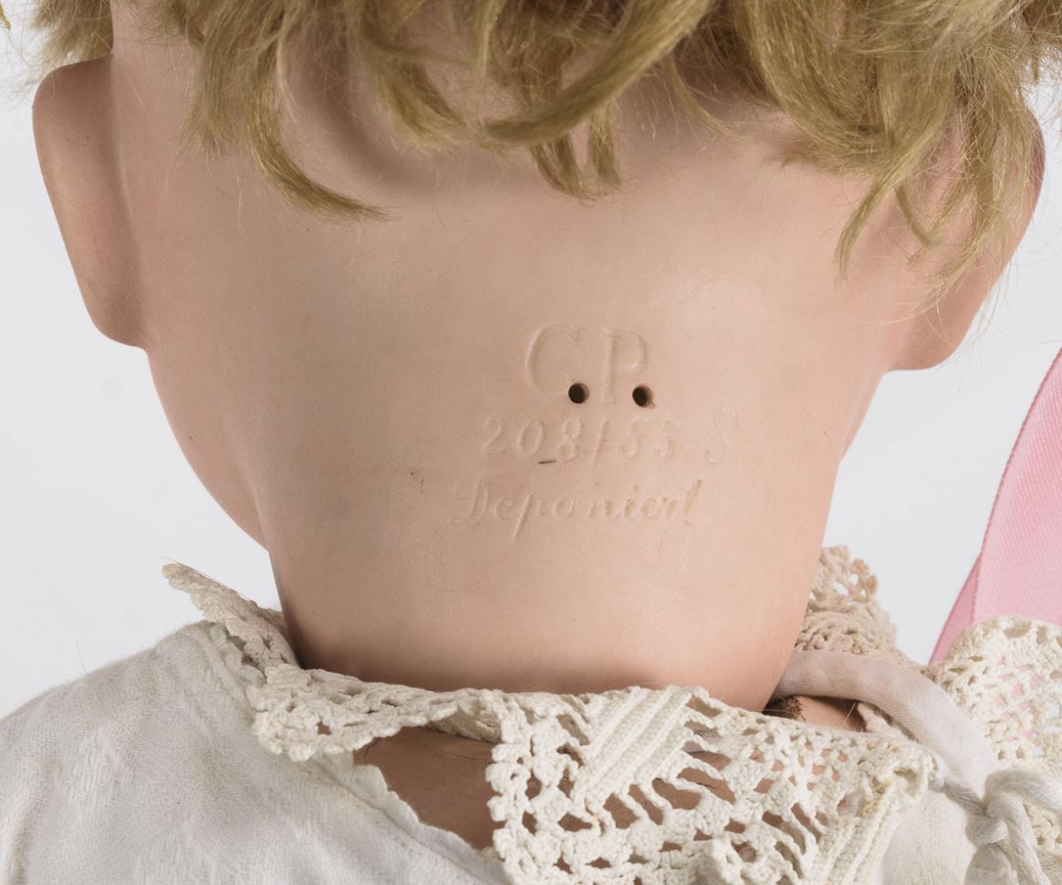 Crank head, brown sleeping eyes, 2 modeled teeth, blond mohair wig. 5-piece sitting baby body with 2-piece torso. White dress with pink bow, straw hat. Head x-rayed: without defects. Head and body loosely stretched, hands rubbed, voice silenced.