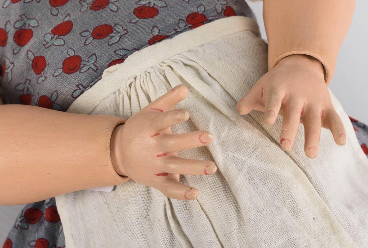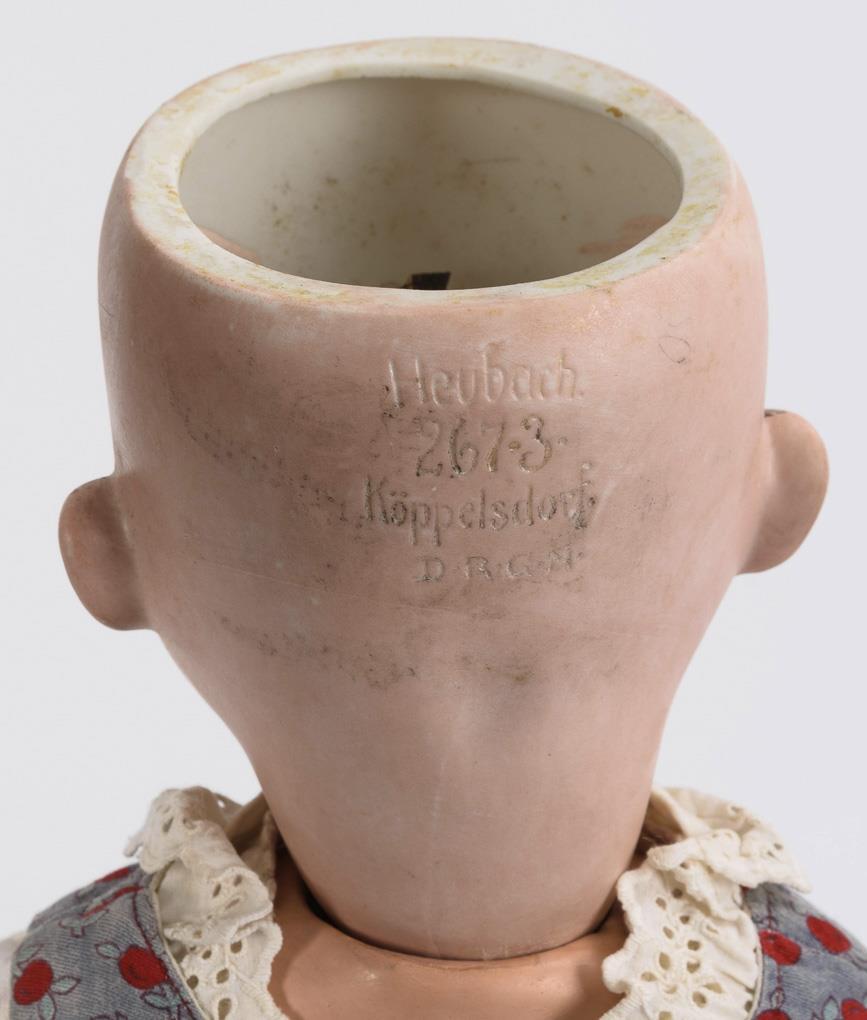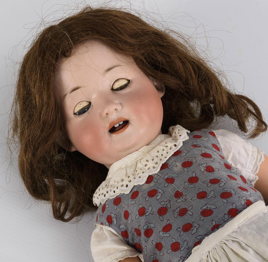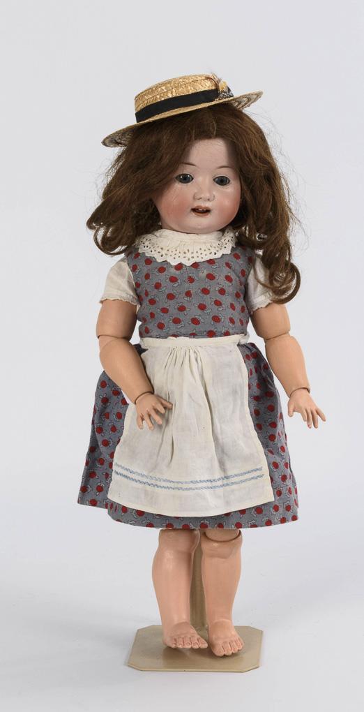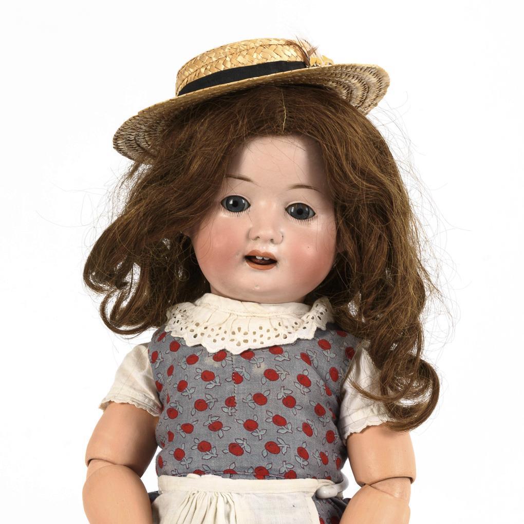Crank head, blue sleeping eyes, eyelash remnants, brown human hair wig. 15-piece toddler body. Younger dress with red roses, white apron, straw hat. Head x-rayed: short burn crack and small ash spot on the crown of the head. Body painted over.