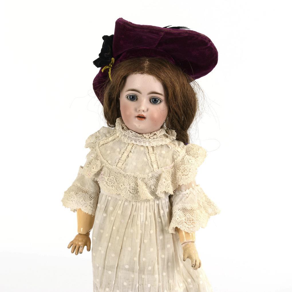 Blue eyes, pierced ears, brown human hair wig. Slim leather body with link arms. Long white dress, purple velvet hat, 1 shoe missing. Head not x-rayed: without visible defects. Left hand painted over.