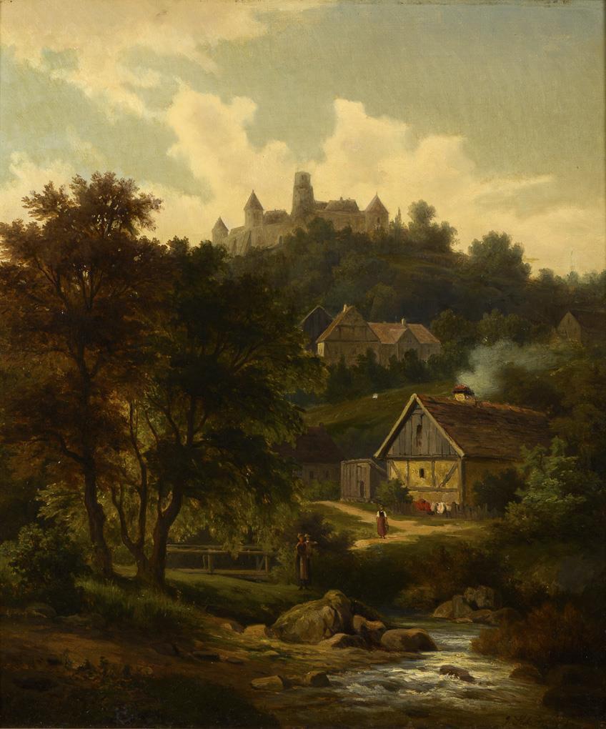 Staffage figures in the warm sunshine at a stream and the village houses with a view to the castle complex on the mountain. A small restored spot with backing.