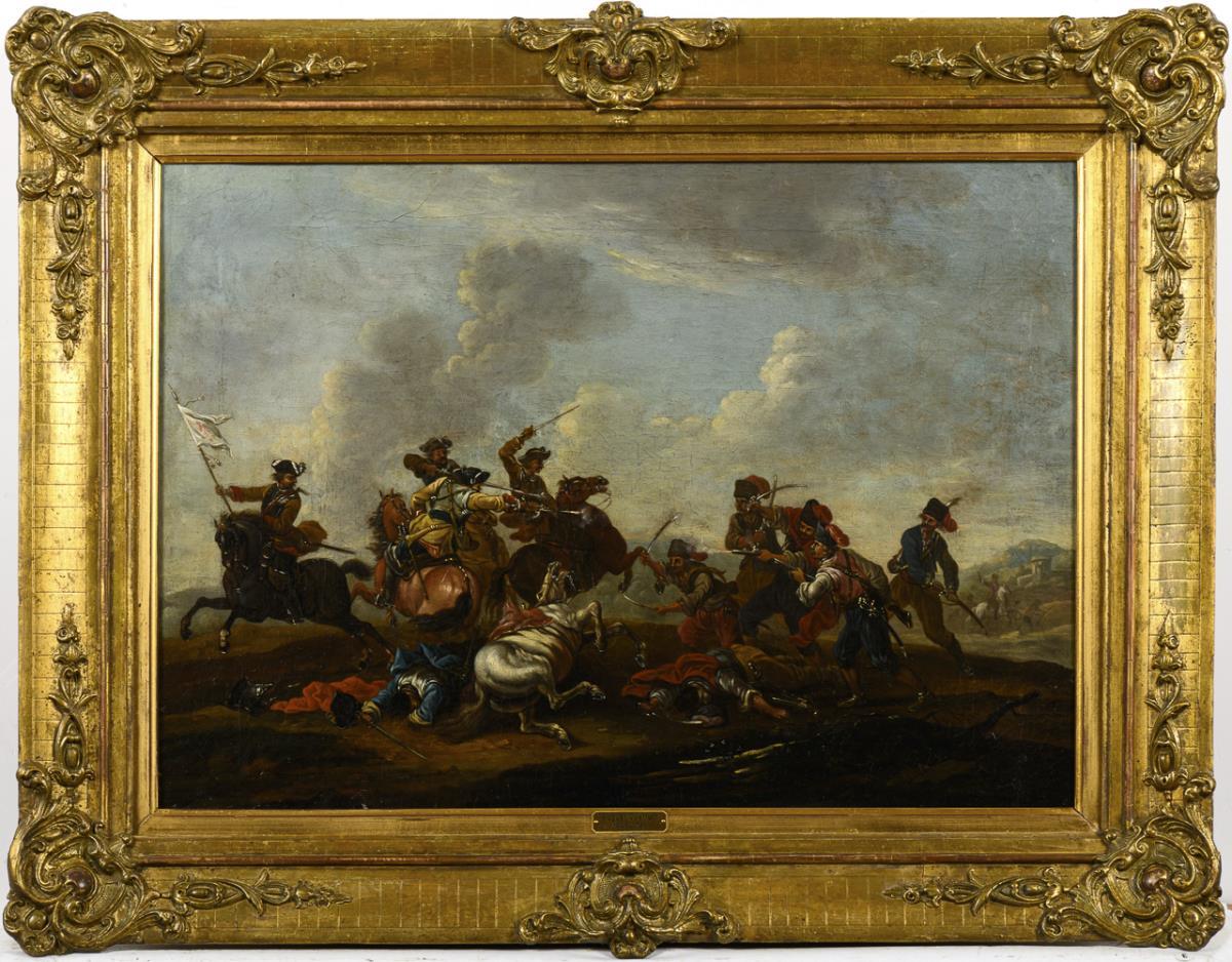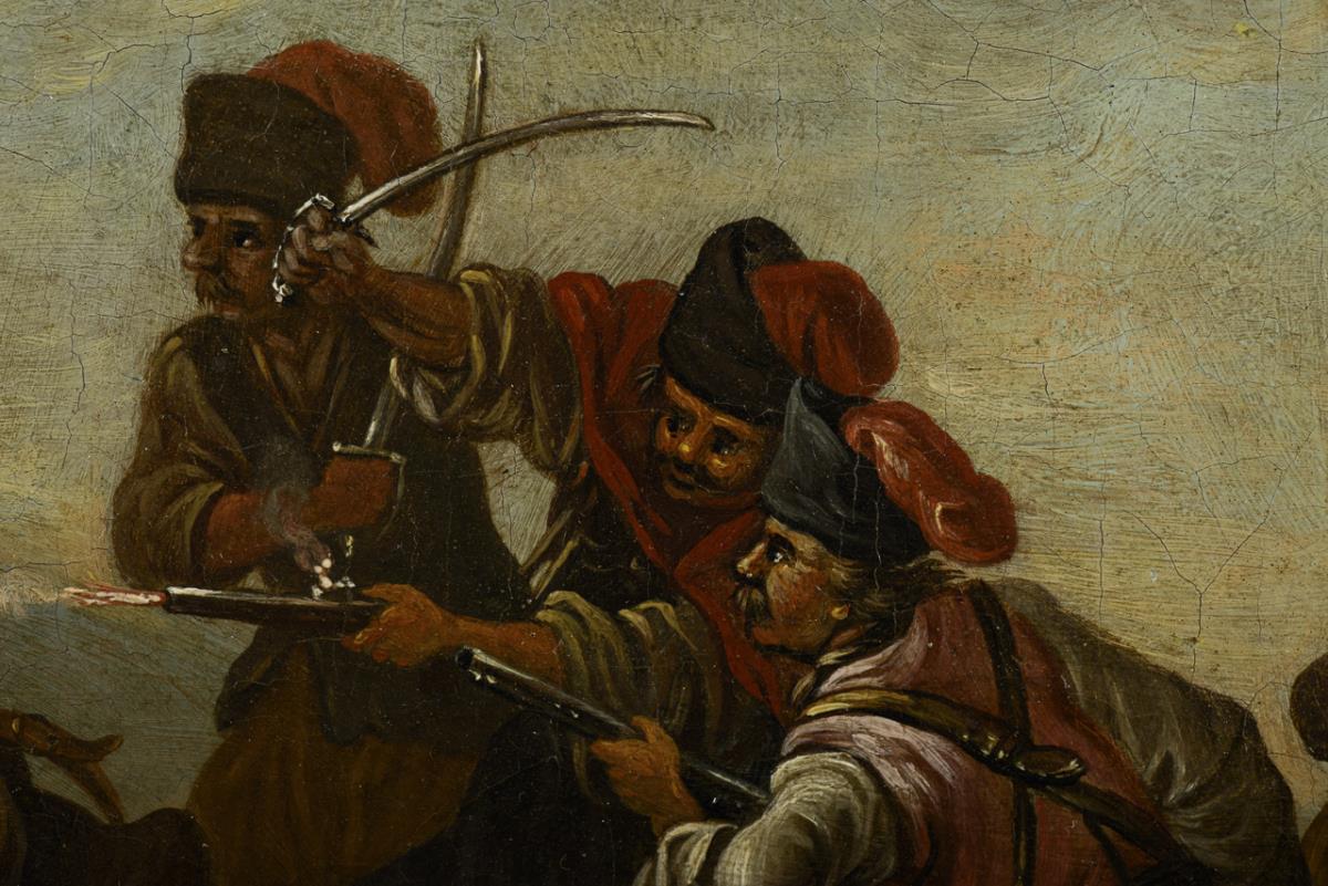 The horsemen with the infantry in the thick of battle among the wounded and dead on the hill. Canvas doubled.