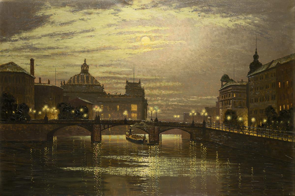 "Moonlight over Berlin. Reichstag building with Marschallbrücke"