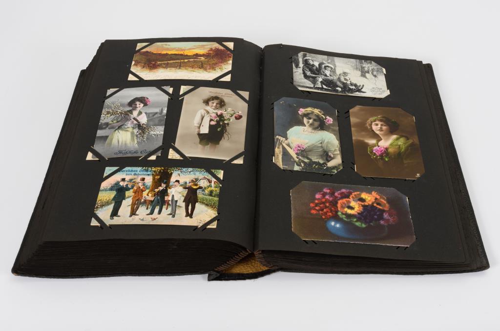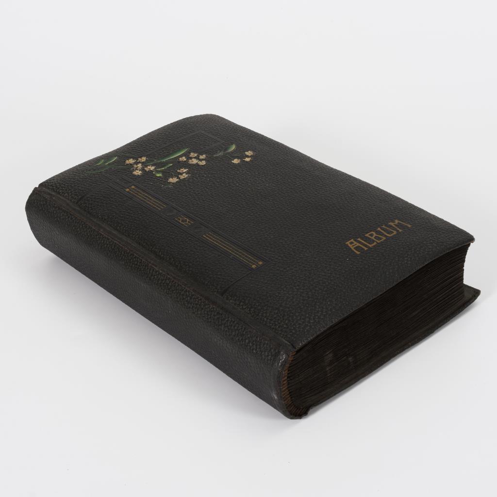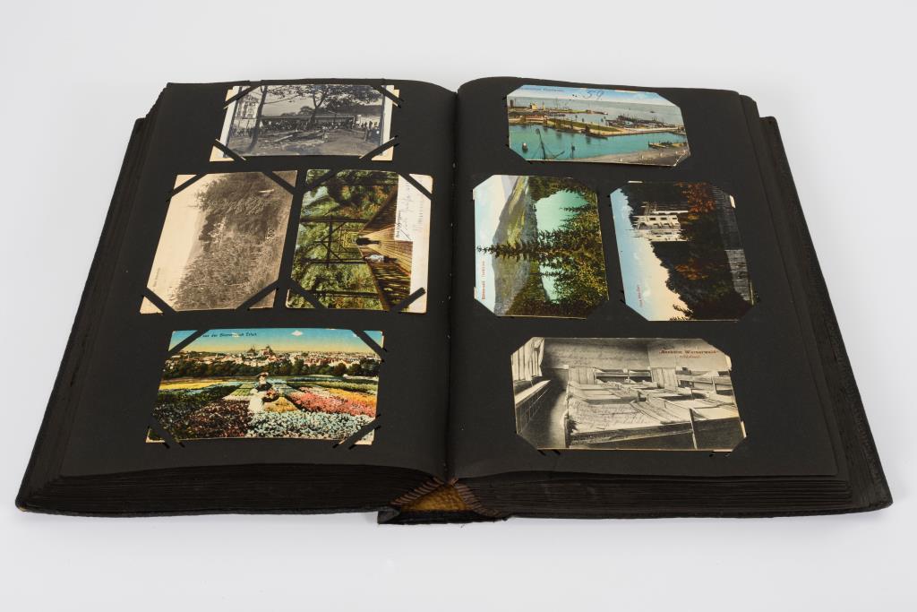 Sehr gehaltvolles Album, darunter "Gruß aus ...", Lithographien und seltene Motivkarten. Schwarzer Ledereinband mit weißen Blüten.