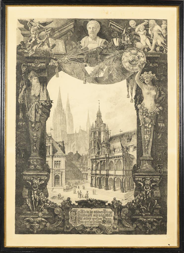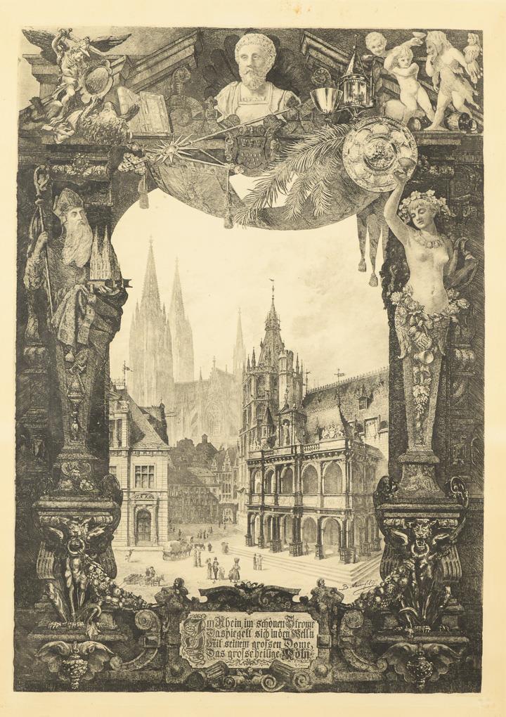 View of Cologne Cathedral with forecourt through lushly decorated framing and poem by Heinrich Heine "Im Rhein, im schönen Strome, Da spiegelt sich in den Welln, Mit seinem großen Dome, Das große, heilge Köln.", verso pencil note "plate found after World War 2". Sheet browned, some foxing.