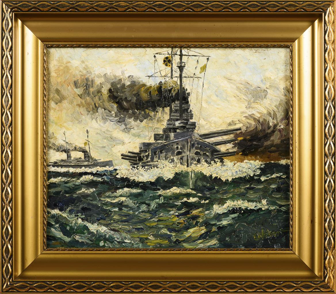 The SMS Kaiser firing a broadside in full speed towards the viewer. In the background the SMS Frederick the Great. 1 small restored spot.