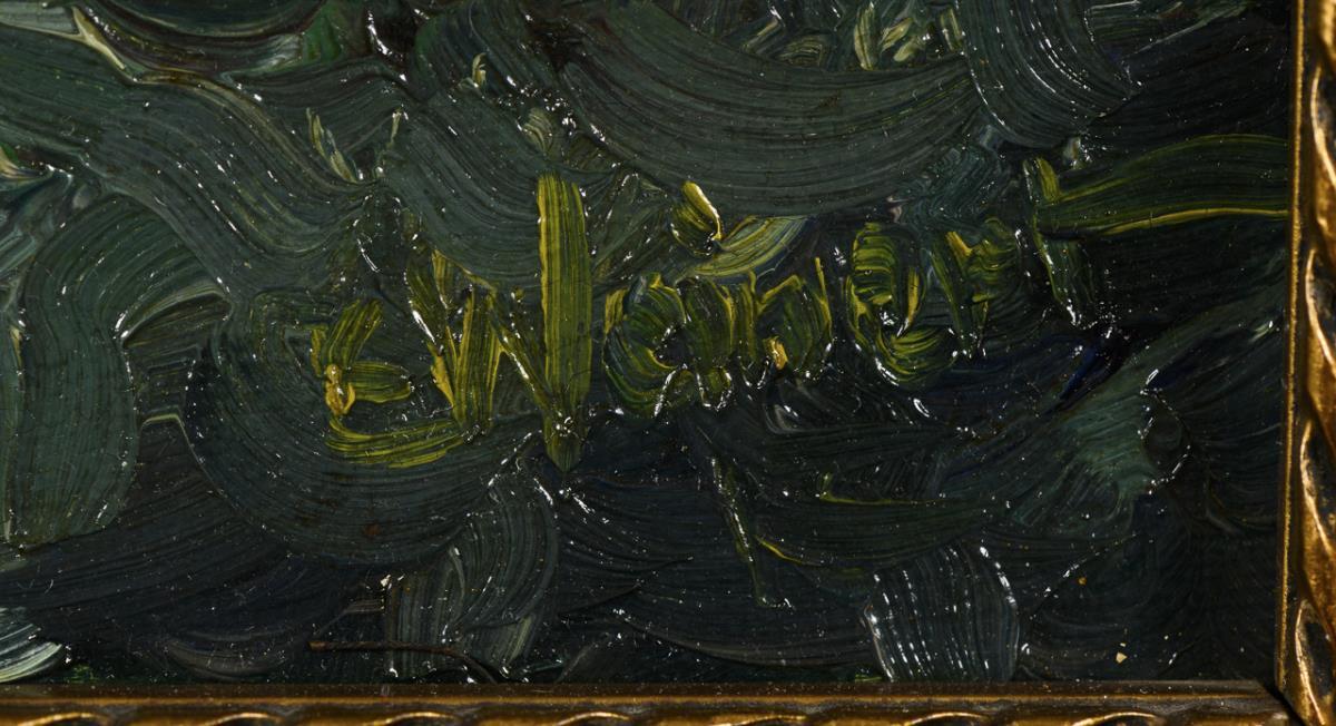 Oil / canvas. Signed lower right, indistinct ship naming on verso.