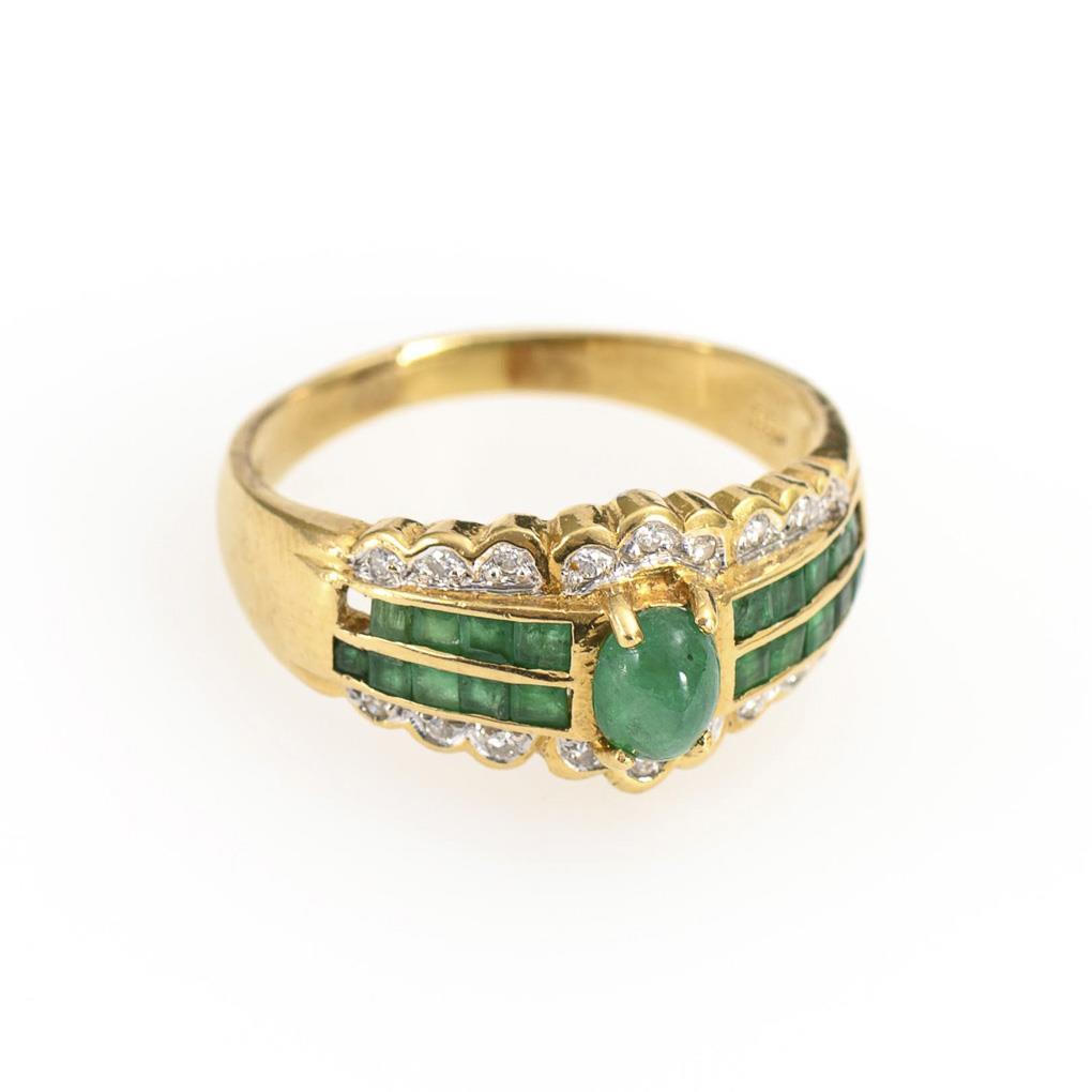 Emerald cabochon, 19 emerald carrés and 18 small inset diamonds, between center rail. 1 emerald carré missing.