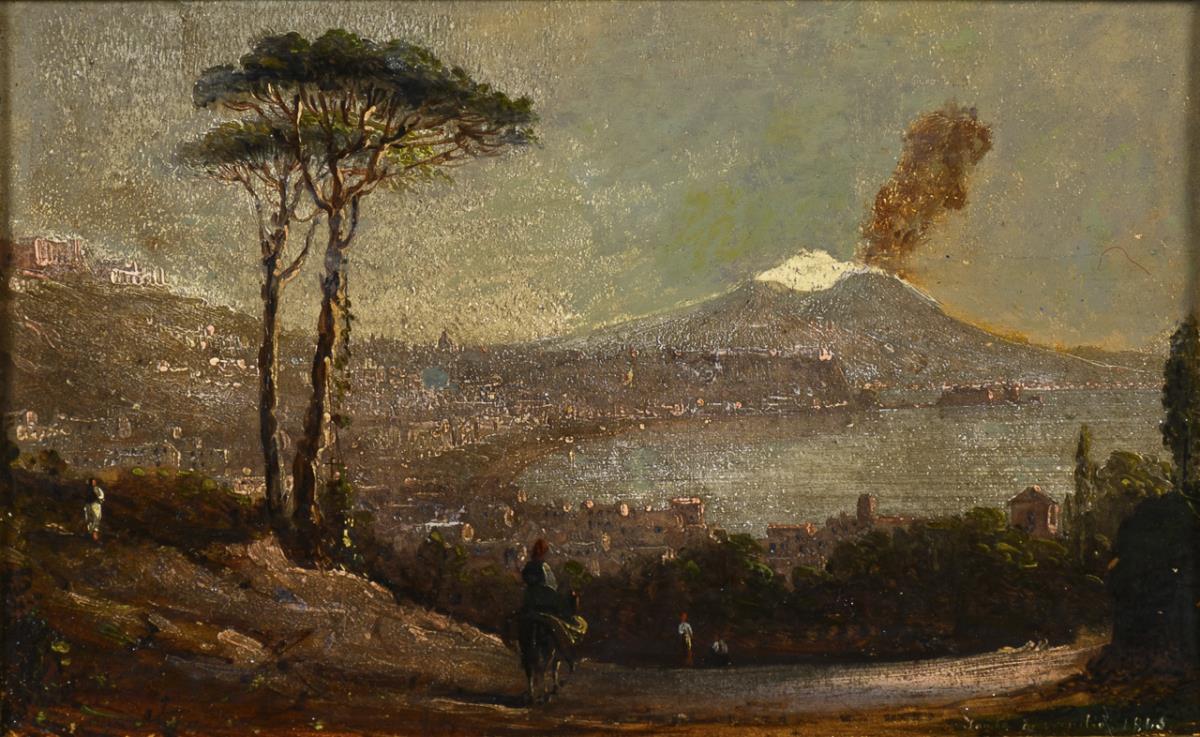 View over the city to the smoking Vesuvius or staffage figures on the terrace high above the city. Crack marks, retouched.