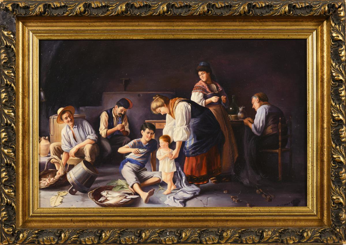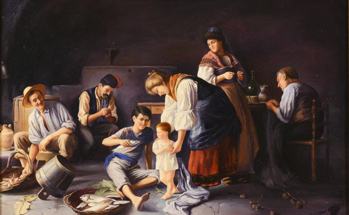 Finely painted fishing family in the bright highlight mostly at work on the fish baskets and nets.