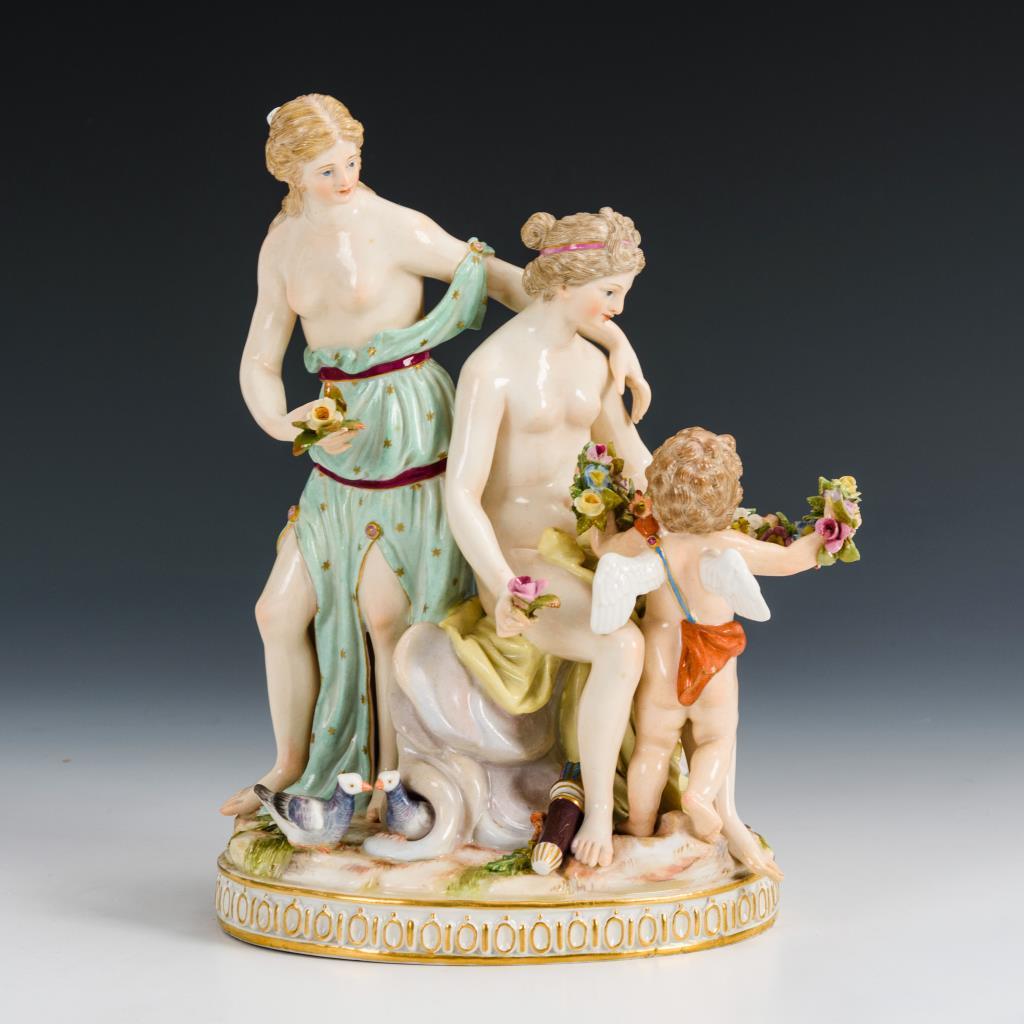 Auf einem Wolkensockel sitzende Venus mit Nymphe sowie ein Amorknabe mit Girlande. Blüten partiell bestoßen, 2 Zehen der Venus sowie vereinzelt Blütenblätter restauriert.